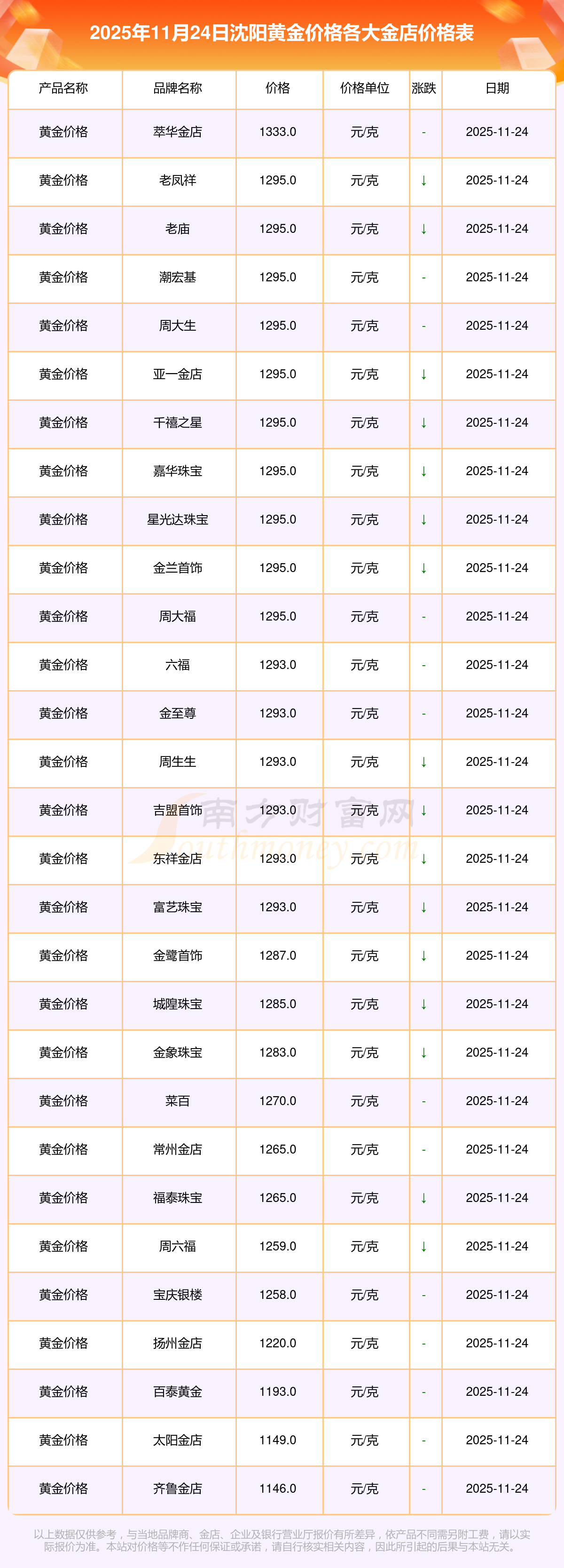 2025年11月24日,沈陽周大福、周大福、周大福、老鳳祥、老鳳祥、老鳳祥、周六福、周六福、周六福、周六福、六福等各大金店品牌黃金價格今日價格行情最新來了:周大福17630.0、周大福40570.0、周大福1134.0元/克、老鳳祥1295.0元/克、老鳳祥600.0元/克、老鳳祥1295.0元/克、周六福1259.0元/克、周六福590.0元/克、周六福590.0元/克、周六福1154.0元/克、六福1293.0元/克。