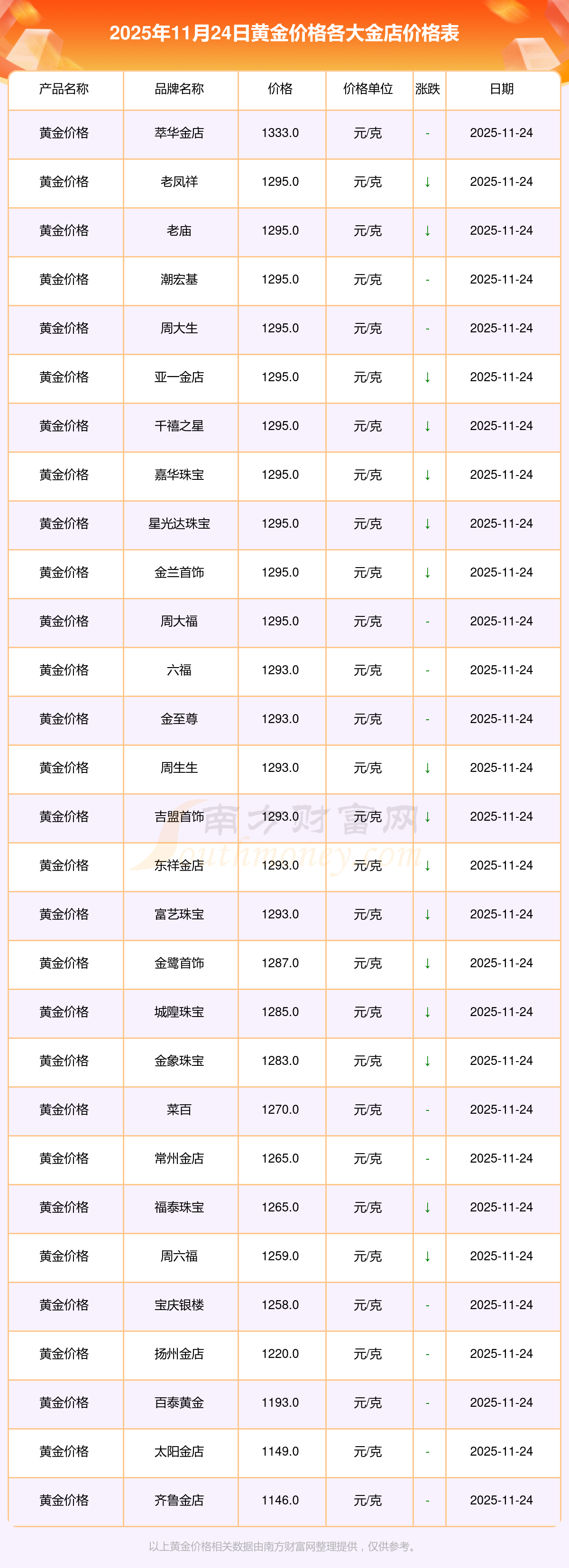 2025年11月24日,周大福、周大福、周大福、老鳳祥、老鳳祥、老鳳祥、周六福、周六福、周六福、周六福、六福等各大金店品牌黃金價格今日價格如下:周大福17630.0、周大福40570.0、周大福1134.0元/克、老鳳祥1295.0元/克、老鳳祥600.0元/克、老鳳祥1295.0元/克、周六福1259.0元/克、周六福590.0元/克、周六福590.0元/克、周六福1154.0元/克、六福1293.0元/克。