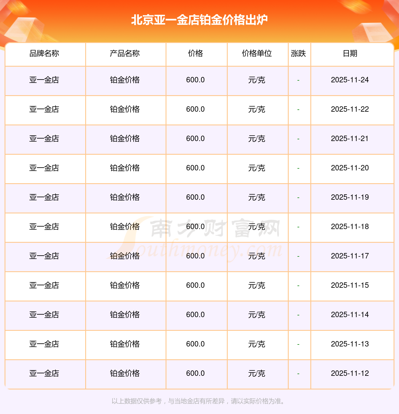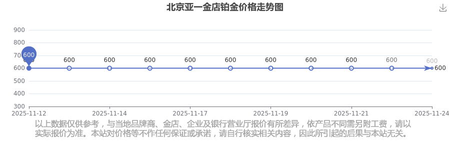 2025年11月24日,北京亞一金店所售鉑金價格,其價格設(shè)定為 600.0元/克。