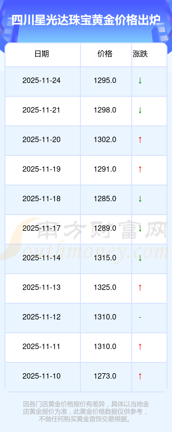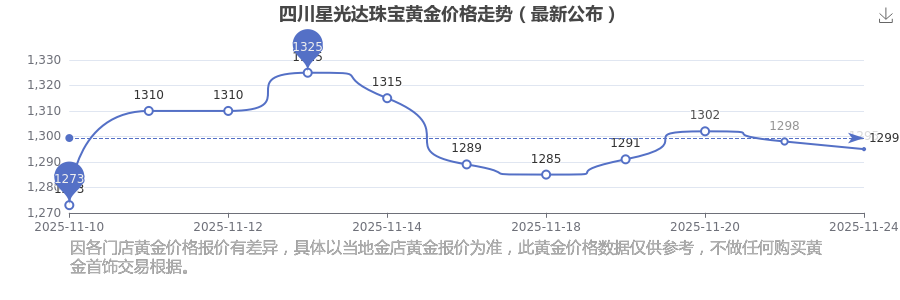于 2025年11月24日,四川星光達(dá)珠寶黃金價(jià)格的克價(jià)為1295.0元/克。