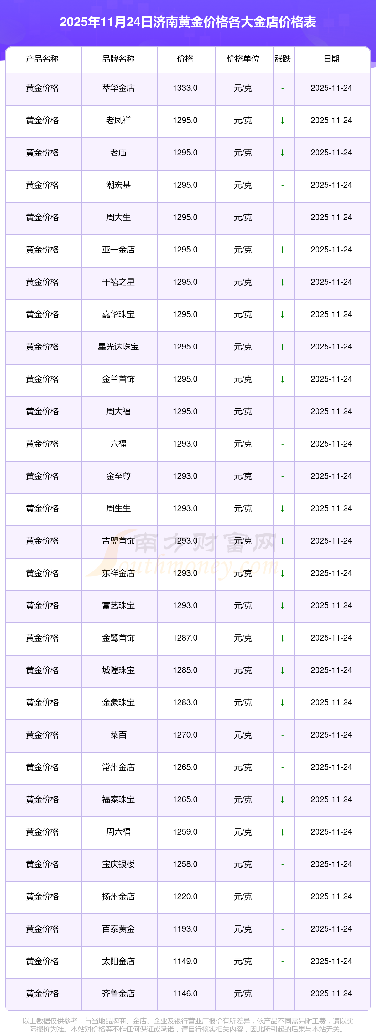 2025年11月24日濟(jì)南各大金店黃金價(jià)格最新價(jià)格查詢來(lái)了:周大福17630.0,周大福40570.0,周大福1134.0元/克,老鳳祥1295.0元/克,老鳳祥600.0元/克,老鳳祥1295.0元/克,周六福1259.0元/克,周六福590.0元/克,周六福590.0元/克,周六福1154.0元/克,六福1293.0元/克。