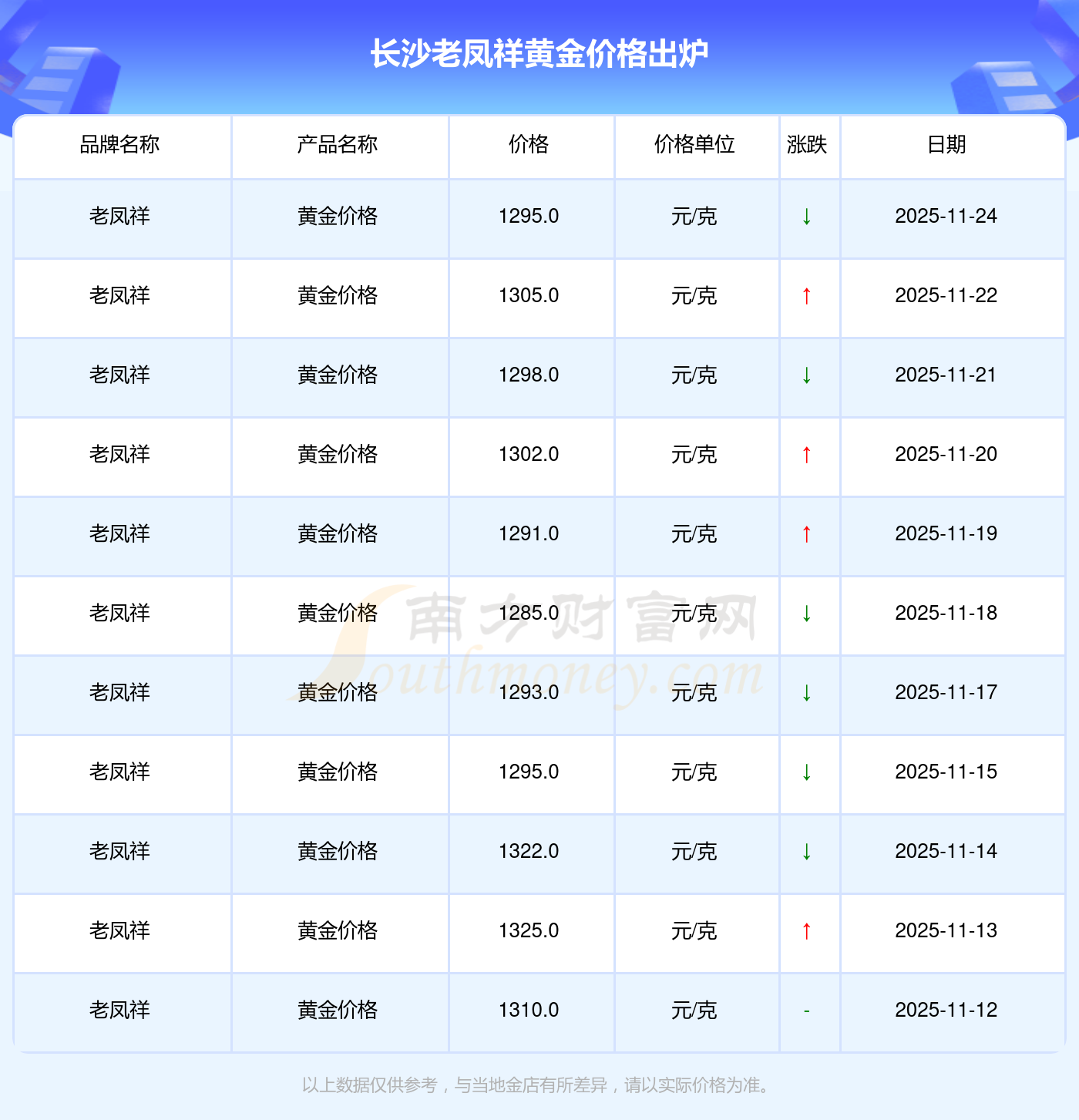 今日長沙老鳳祥黃金價格公布黃金價格今天多少一克2025年11月24日,長沙老鳳祥黃金價格每克的售賣價位為1295.0元/克。