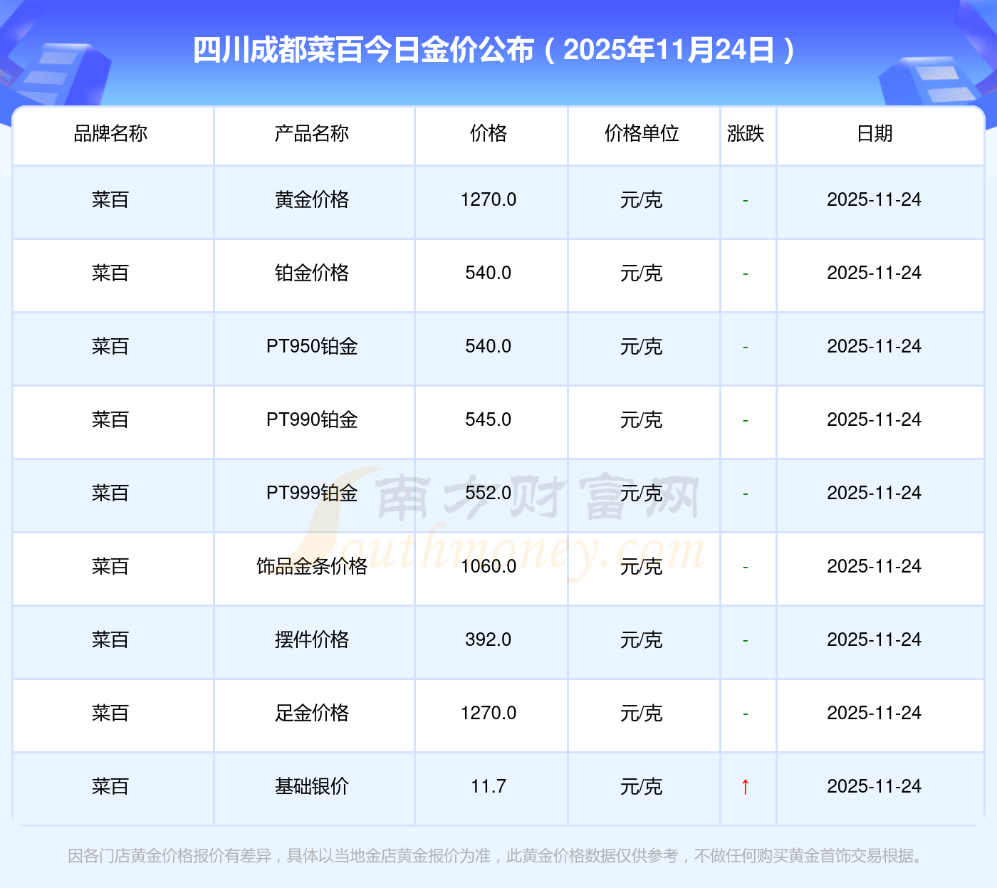 2025年11月24日四川成都菜百金價查詢:鉑金價格(香港)17630.0,金條價格(香港)40570.0,金條金價(內(nèi)地)1134.0元/克,黃金價格1295.0元/克,鉑金價格600.0元/克,足金價格1295.0元/克,黃金價格1259.0元/克,鉑金價格590.0元/克,PT999鉑金價格590.0元/克,金條價格1154.0元/克,黃金價格1293.0元/克。