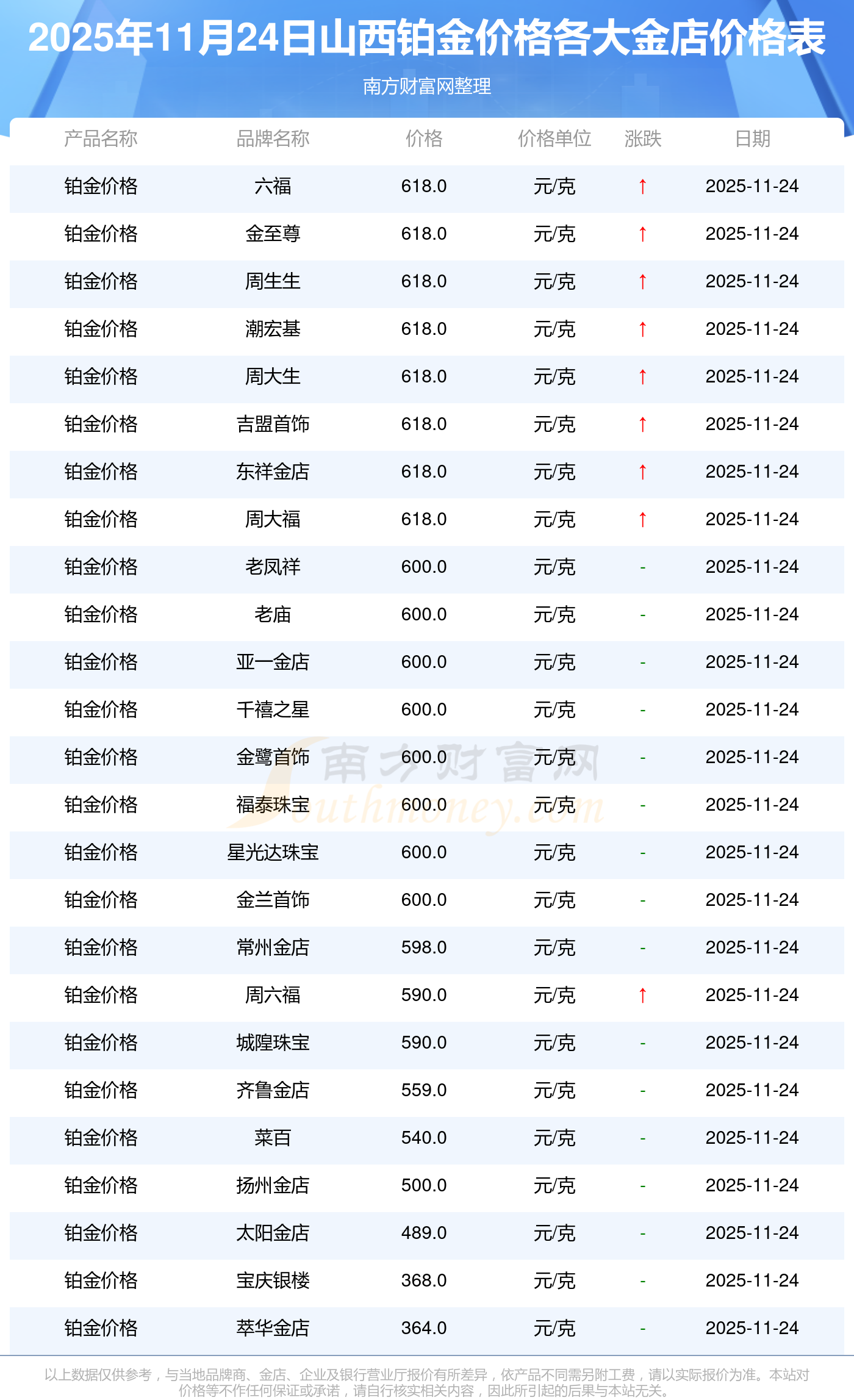 2025年11月24日山西各大金店鉑金價(jià)格最新價(jià)格查詢來了:周大福17630.0,周大福40570.0,周大福1134.0元/克,老鳳祥1295.0元/克,老鳳祥600.0元/克,老鳳祥1295.0元/克,周六福1259.0元/克,周六福590.0元/克,周六福590.0元/克,周六福1154.0元/克,六福1293.0元/克。
