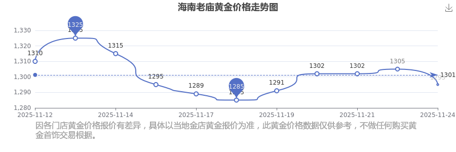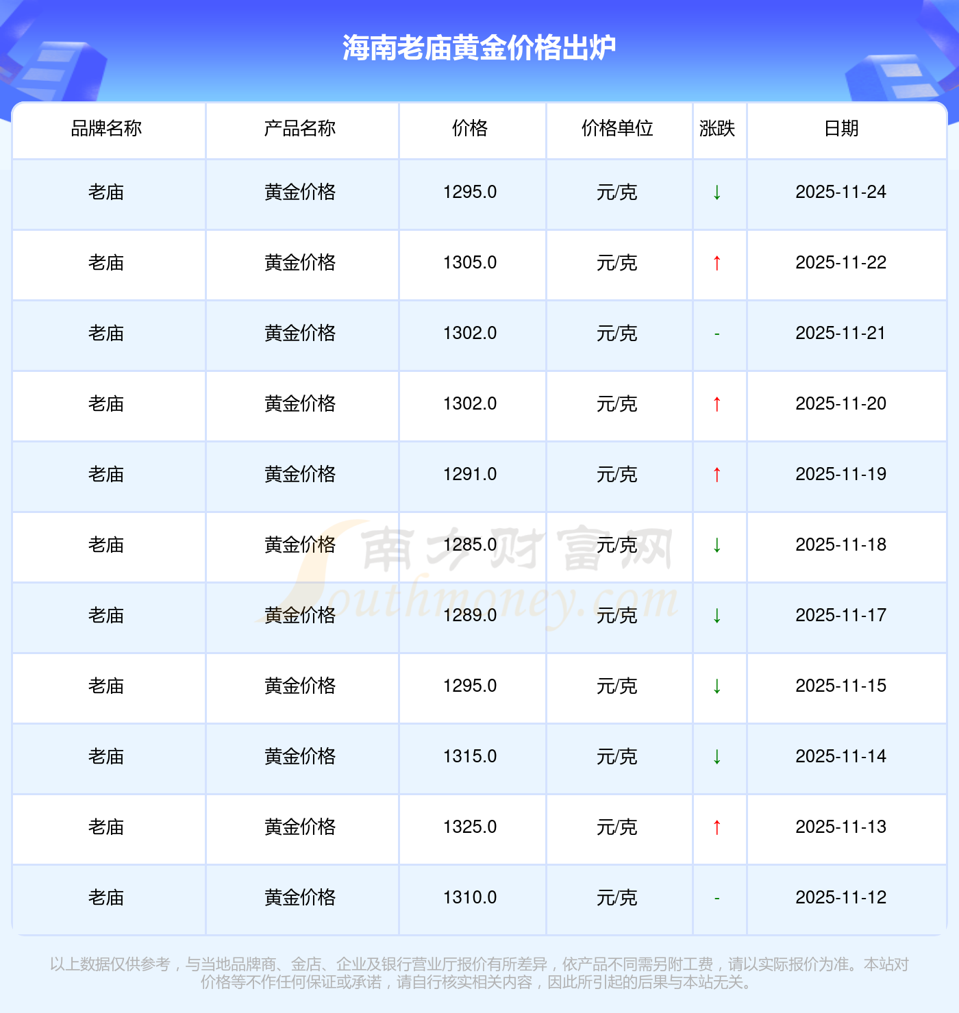 2025年11月24日這一天,海南老廟的黃金價(jià)格以 1295.0元/克的價(jià)格售賣。