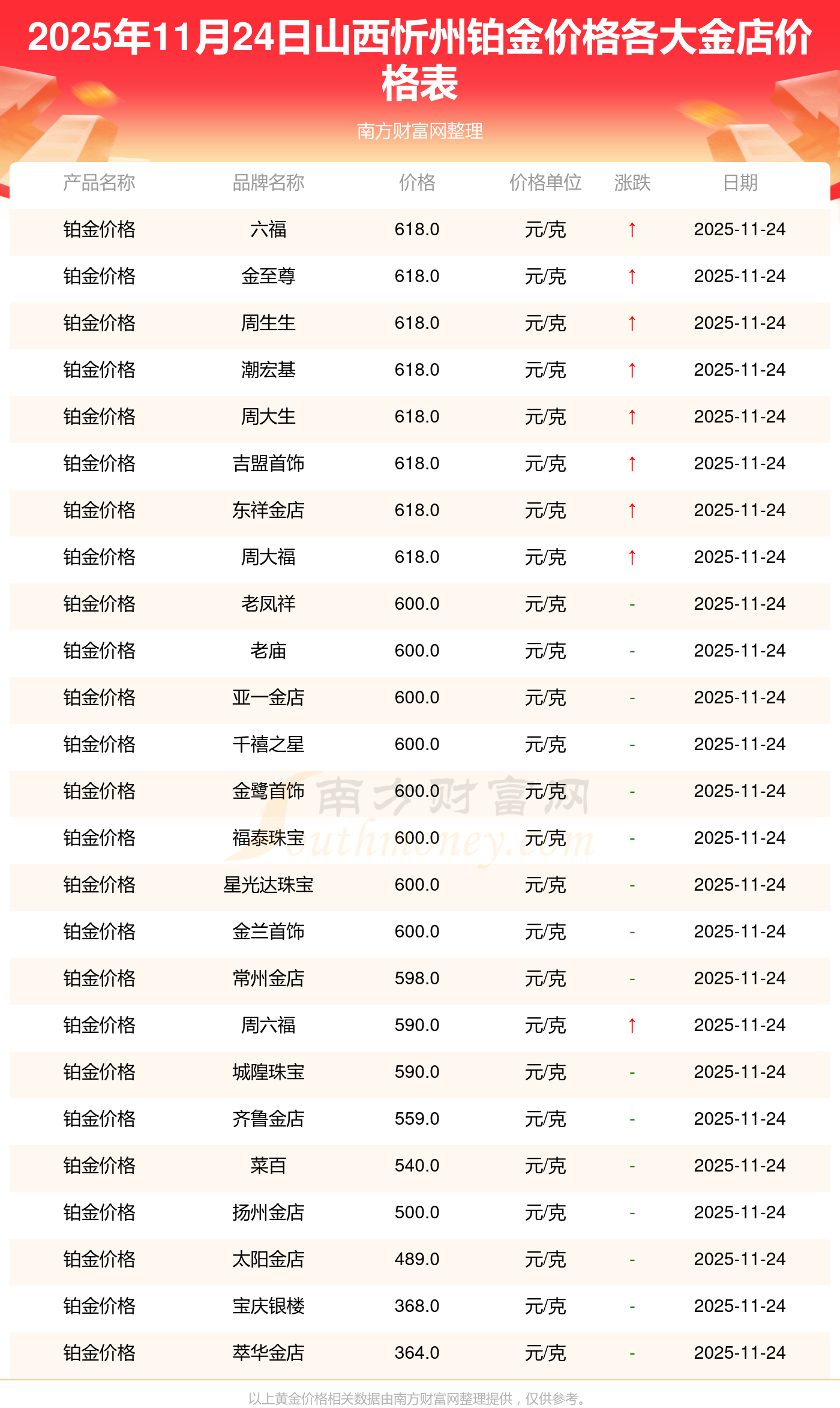 2025年11月24日,山西忻州周大福、周大福、周大福、老鳳祥、老鳳祥、老鳳祥、周六福、周六福、周六福、周六福、六福等各大金店品牌鉑金價(jià)格今日價(jià)格如下:周大福17630.0、周大福40570.0、周大福1134.0元/克、老鳳祥1295.0元/克、老鳳祥600.0元/克、老鳳祥1295.0元/克、周六福1259.0元/克、周六福590.0元/克、周六福590.0元/克、周六福1154.0元/克、六福1293.0元/克。