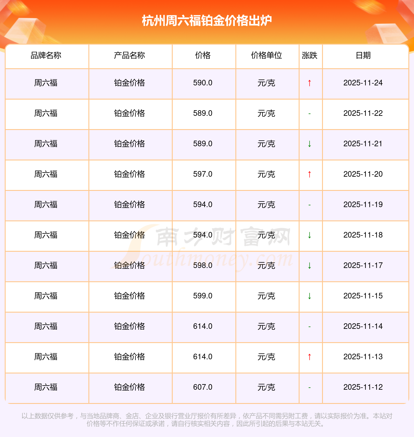 今天是2025年11月24日,周大福、周大福、周大福、老鳳祥、老鳳祥、老鳳祥、周六福、周六福、周六福、周六福、六福等各大金店品牌鉑金價(jià)格最新價(jià)格如下:周大福17630.0、周大福40570.0、周大福1134.0元/克、老鳳祥1295.0元/克、老鳳祥600.0元/克、老鳳祥1295.0元/克、周六福1259.0元/克、周六福590.0元/克、周六福590.0元/克、周六福1154.0元/克、六福1293.0元/克。