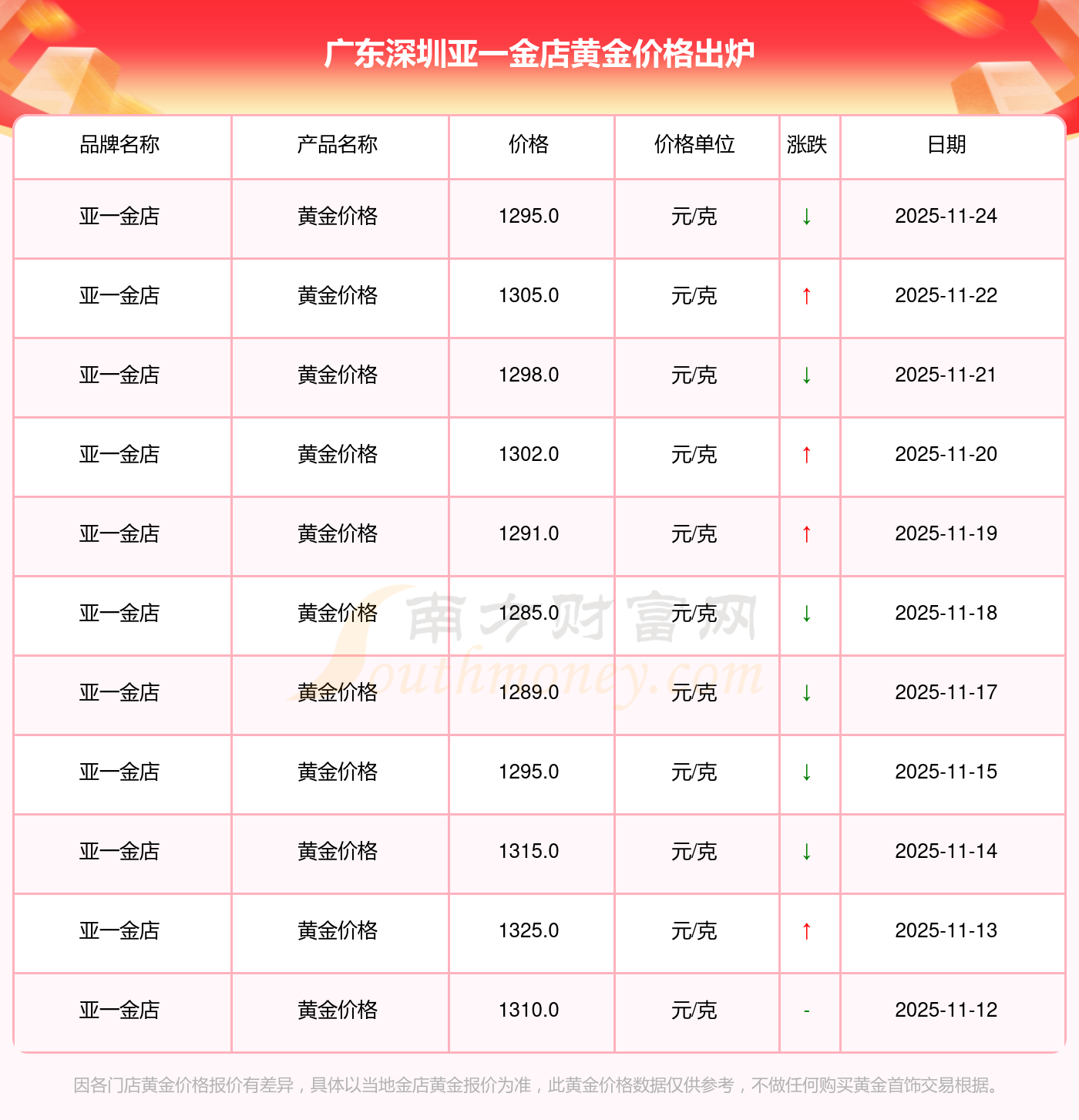廣東深圳亞一金店黃金價格在 2025年11月24日,其市場價格為 1295.0元/克。