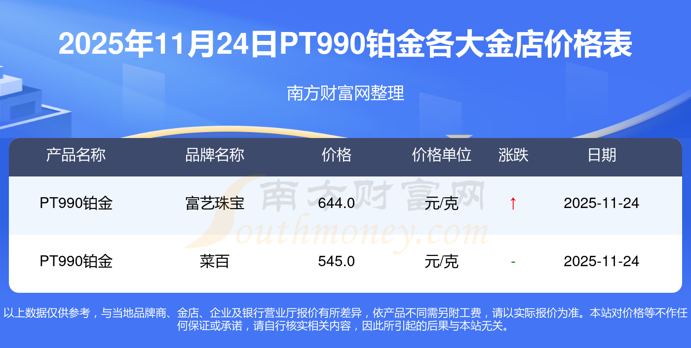2025年11月24日各大金店P(guān)T990鉑金最新價格:周大福17630.0,周大福40570.0,周大福1134.0元/克,老鳳祥1295.0元/克,老鳳祥600.0元/克,老鳳祥1295.0元/克,周六福1259.0元/克,周六福590.0元/克,周六福590.0元/克,周六福1154.0元/克,六福1293.0元/克。