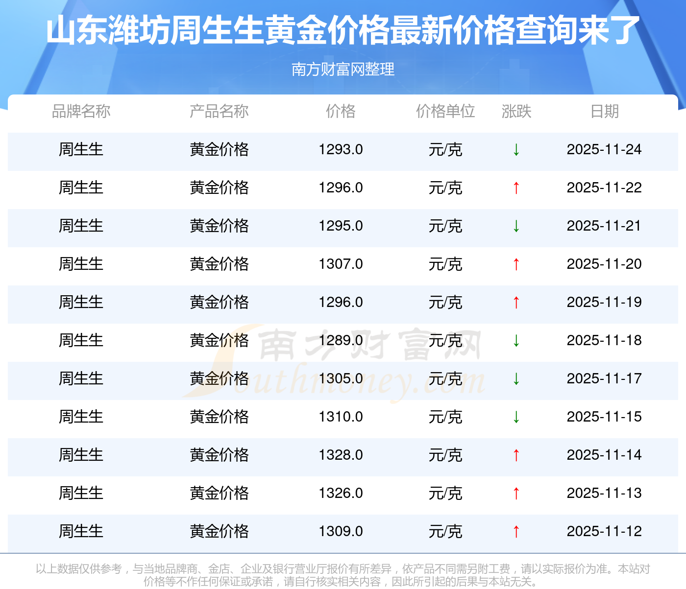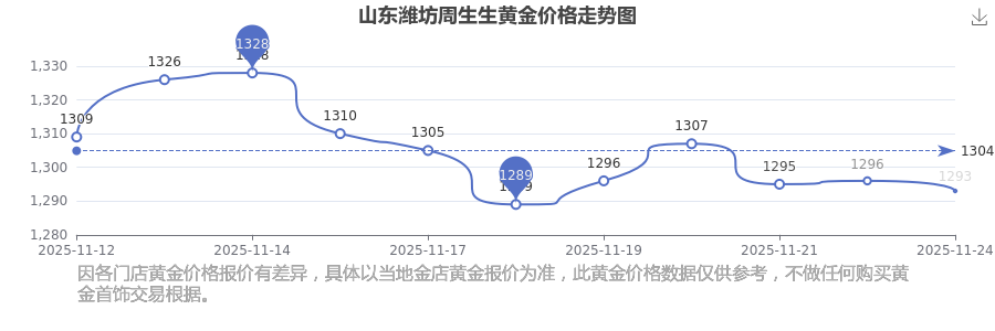 山東濰坊周生生黃金價格在 2025年11月24日為 1293.0元/克。