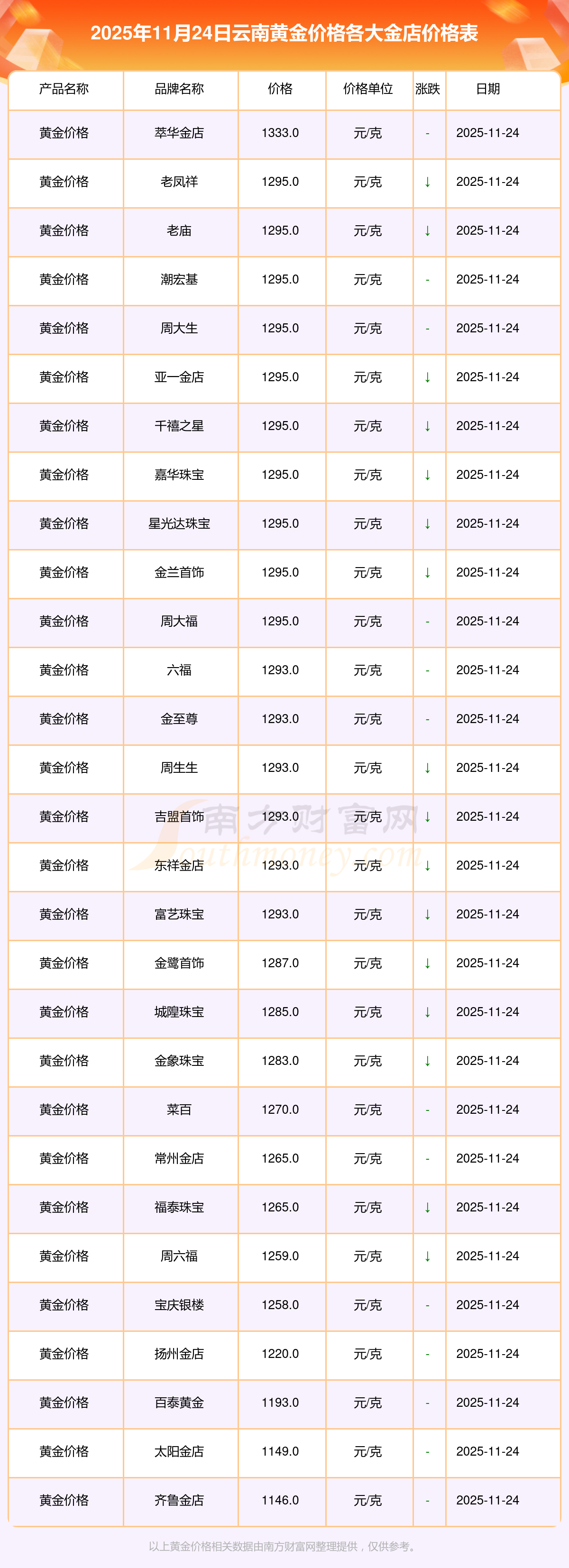 2025年11月24日云南各大金店黃金價格最新價格查詢來了:周大福17630.0,周大福40570.0,周大福1134.0元/克,老鳳祥1295.0元/克,老鳳祥600.0元/克,老鳳祥1295.0元/克,周六福1259.0元/克,周六福590.0元/克,周六福590.0元/克,周六福1154.0元/克,六福1293.0元/克。