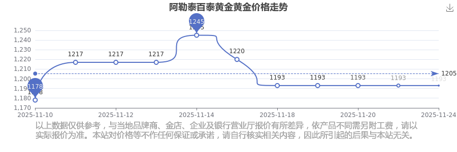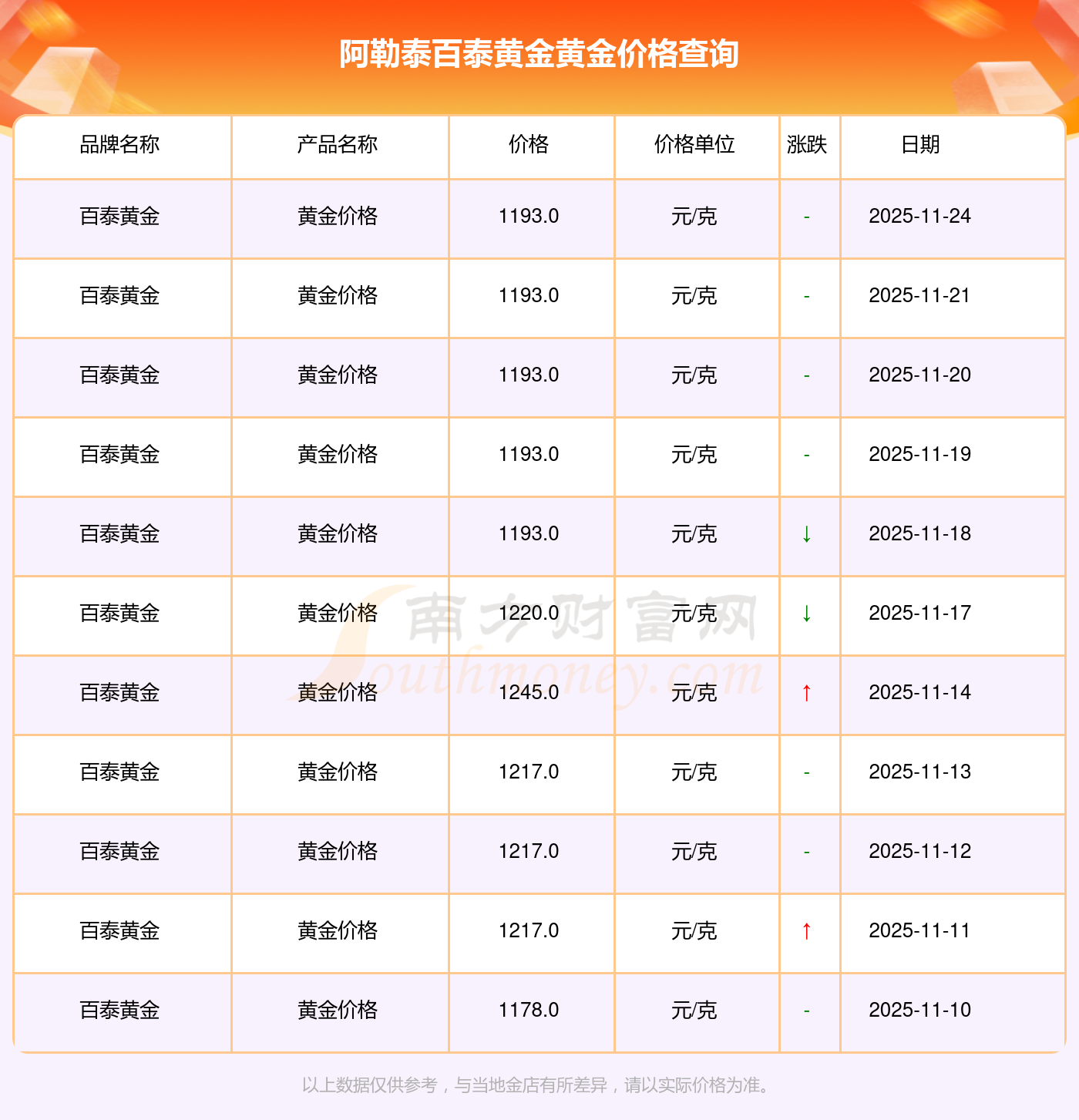 2025年11月24日,阿勒泰百泰黃金黃金價(jià)格每克的價(jià)值量定格在1193.0元/克。