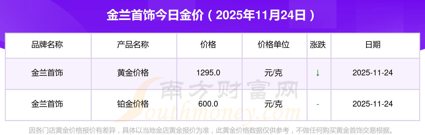 2025年11月24日周大福、周大福、周大福、老鳳祥、老鳳祥、老鳳祥、周六福、周六福、周六福、周六福、六福等各大金店品牌黃金價(jià)格最新價(jià)格如下:周大福鉑金價(jià)格(香港)17630.0,周大福金條價(jià)格(香港)40570.0,周大福金條金價(jià)(內(nèi)地)1134.0元/克,老鳳祥黃金價(jià)格1295.0元/克,老鳳祥鉑金價(jià)格600.0元/克,老鳳祥足金價(jià)格1295.0元/克,周六福黃金價(jià)格1259.0元/克,周六福鉑金價(jià)格590.0元/克,周六福PT999鉑金價(jià)格590.0元/克,周六福金條價(jià)格1154.0元/克,六福黃金價(jià)格1293.0元/克。