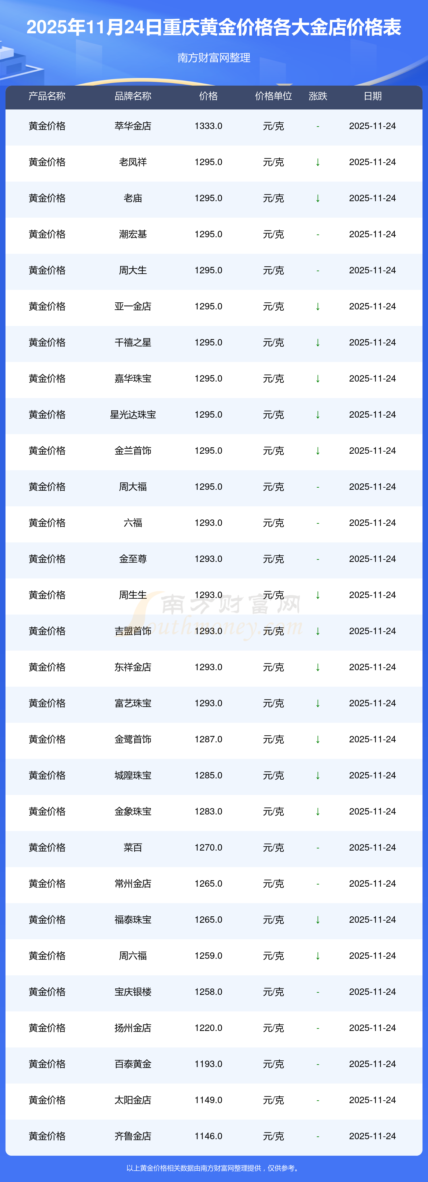2025年11月24日重慶周大福、周大福、周大福、老鳳祥、老鳳祥、老鳳祥、周六福、周六福、周六福、周六福、六福等各大金店品牌黃金價格最新價格行情來了,如下:周大福鉑金價格(香港)17630.0,周大福金條價格(香港)40570.0,周大福金條金價(內(nèi)地)1134.0元/克,老鳳祥黃金價格1295.0元/克,老鳳祥鉑金價格600.0元/克,老鳳祥足金價格1295.0元/克,周六福黃金價格1259.0元/克,周六福鉑金價格590.0元/克,周六福PT999鉑金價格590.0元/克,周六福金條價格1154.0元/克,六福黃金價格1293.0元/克。