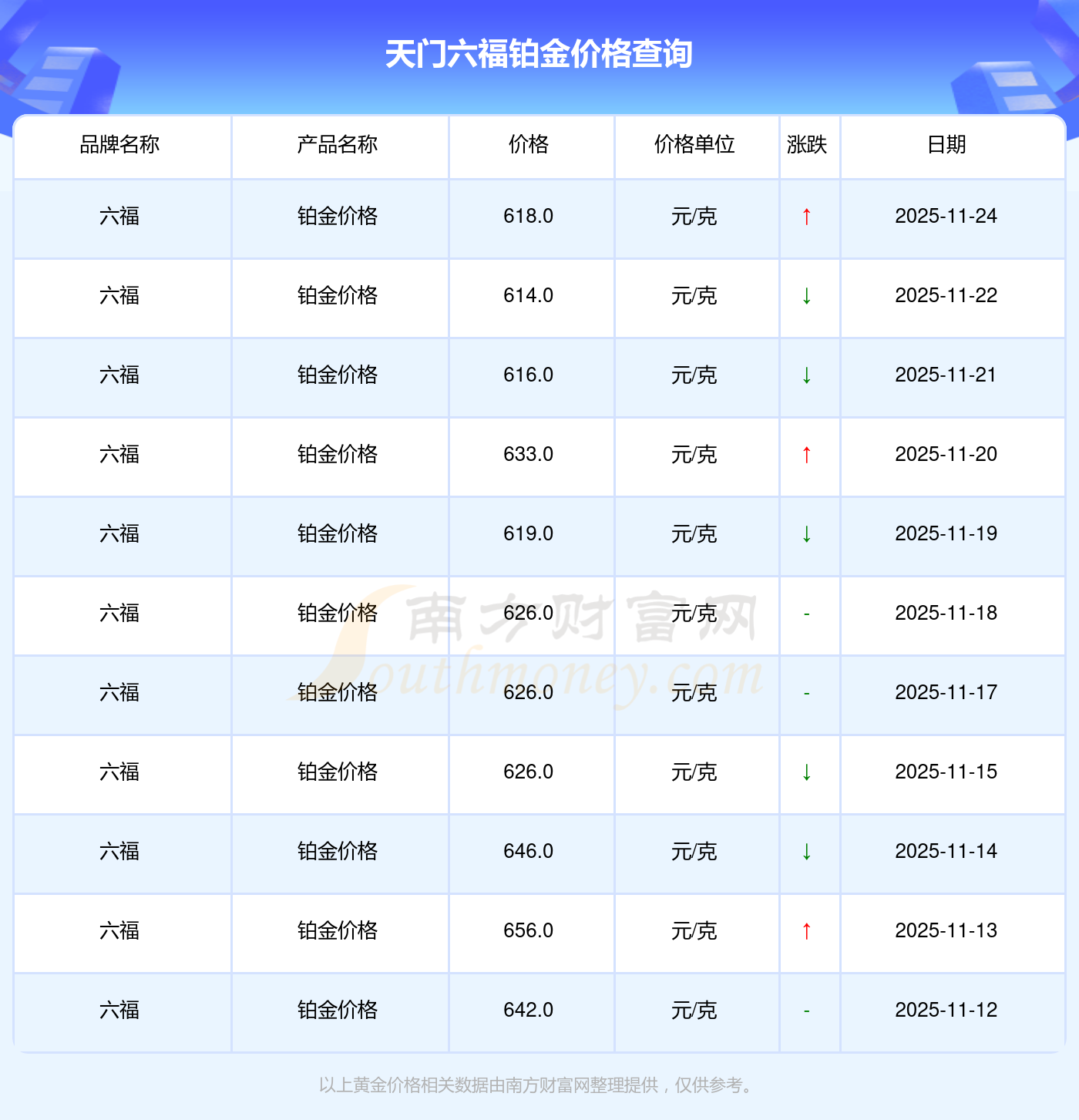 今日2025年11月24日,天門六福鉑金價格為618.0元/克。
