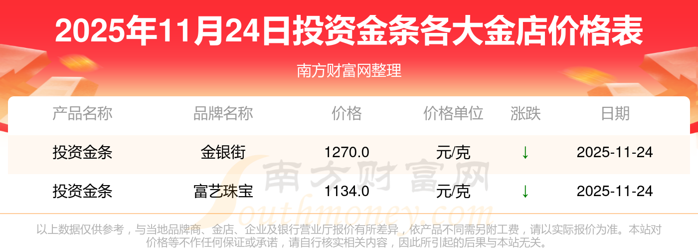 2025年11月24日,周大福、周大福、周大福、老鳳祥、老鳳祥、老鳳祥、周六福、周六福、周六福、周六福、六福等各大金店品牌投資金條今日價格如下:周大福17630.0、周大福40570.0、周大福1134.0元/克、老鳳祥1295.0元/克、老鳳祥600.0元/克、老鳳祥1295.0元/克、周六福1259.0元/克、周六福590.0元/克、周六福590.0元/克、周六福1154.0元/克、六福1293.0元/克。