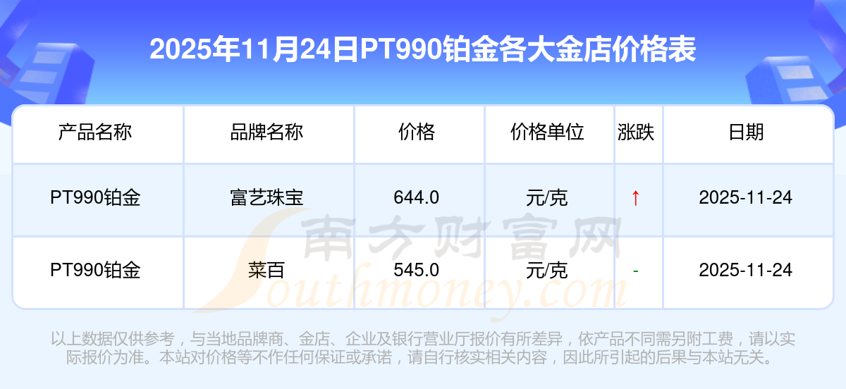 今天是2025年11月24日,周大福、周大福、周大福、老鳳祥、老鳳祥、老鳳祥、周六福、周六福、周六福、周六福、六福等各大金店品牌PT990鉑金最新價(jià)格如下:周大福17630.0、周大福40570.0、周大福1134.0元/克、老鳳祥1295.0元/克、老鳳祥600.0元/克、老鳳祥1295.0元/克、周六福1259.0元/克、周六福590.0元/克、周六福590.0元/克、周六福1154.0元/克、六福1293.0元/克。