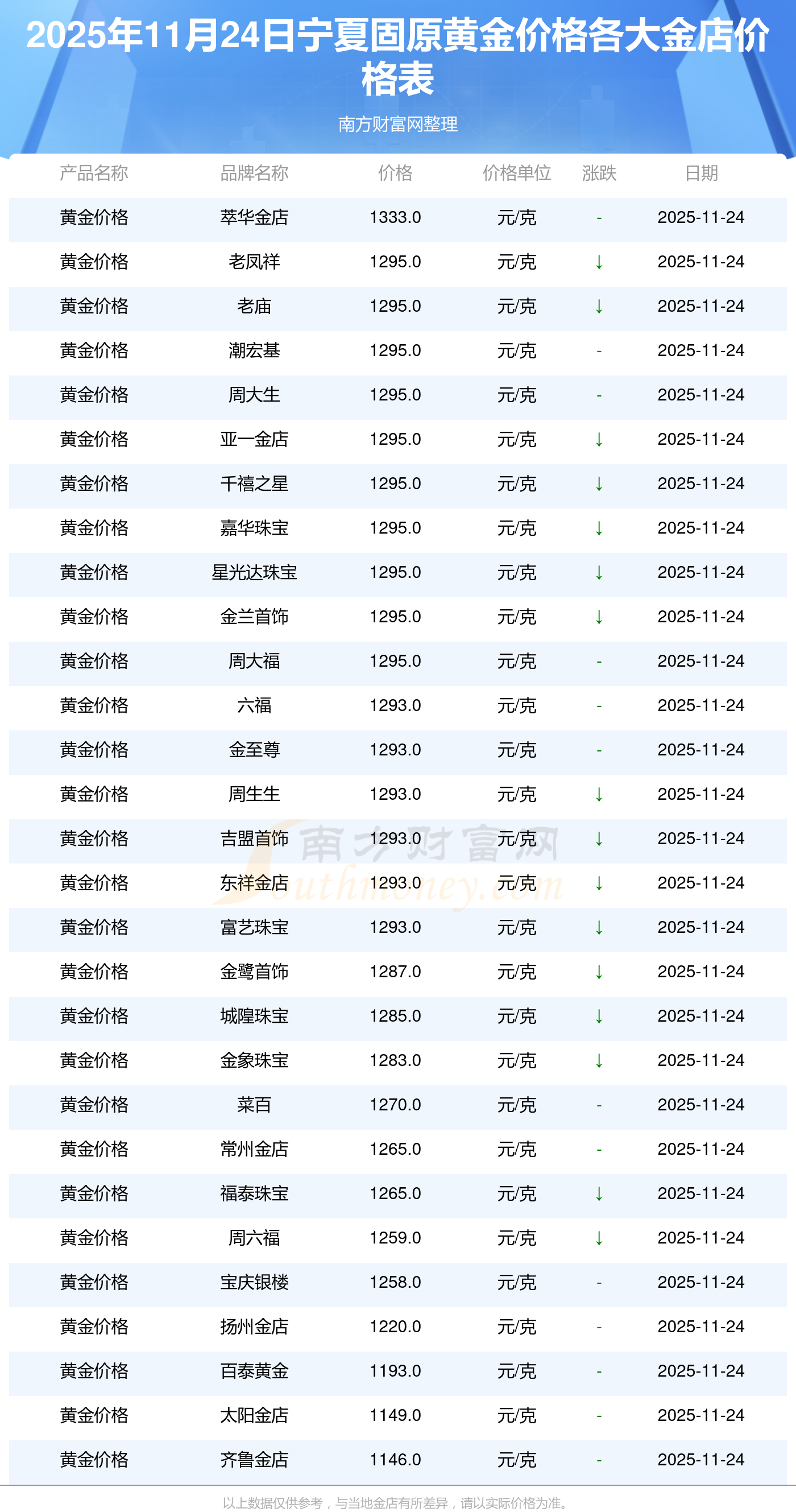 2025年11月24日寧夏固原周大福、周大福、周大福、老鳳祥、老鳳祥、老鳳祥、周六福、周六福、周六福、周六福、六福等各大金店品牌黃金價格最新價格行情來了,如下:周大福鉑金價格(香港)17630.0,周大福金條價格(香港)40570.0,周大福金條金價(內地)1134.0元/克,老鳳祥黃金價格1295.0元/克,老鳳祥鉑金價格600.0元/克,老鳳祥足金價格1295.0元/克,周六福黃金價格1259.0元/克,周六福鉑金價格590.0元/克,周六福PT999鉑金價格590.0元/克,周六福金條價格1154.0元/克,六福黃金價格1293.0元/克。