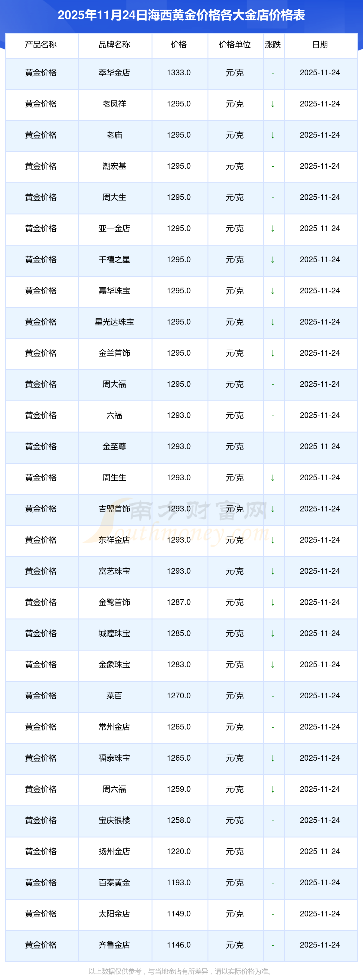 2025年11月24日海西周大福、周大福、周大福、老鳳祥、老鳳祥、老鳳祥、周六福、周六福、周六福、周六福、六福等各大金店品牌黃金價格最新價格行情來了,如下:周大福鉑金價格(香港)17630.0,周大福金條價格(香港)40570.0,周大福金條金價(內(nèi)地)1134.0元/克,老鳳祥黃金價格1295.0元/克,老鳳祥鉑金價格600.0元/克,老鳳祥足金價格1295.0元/克,周六福黃金價格1259.0元/克,周六福鉑金價格590.0元/克,周六福PT999鉑金價格590.0元/克,周六福金條價格1154.0元/克,六福黃金價格1293.0元/克。