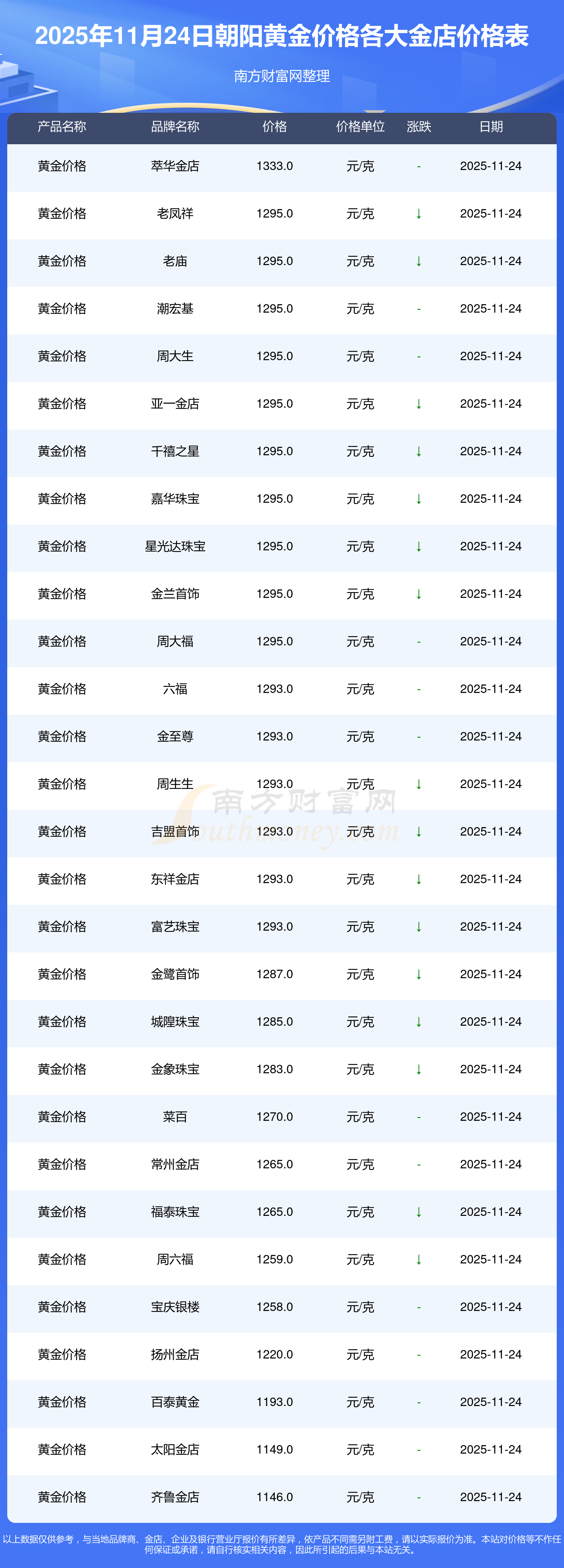 今日朝陽各金店黃金價格今天多少一克?2025年11月24日黃金價格最新查詢表