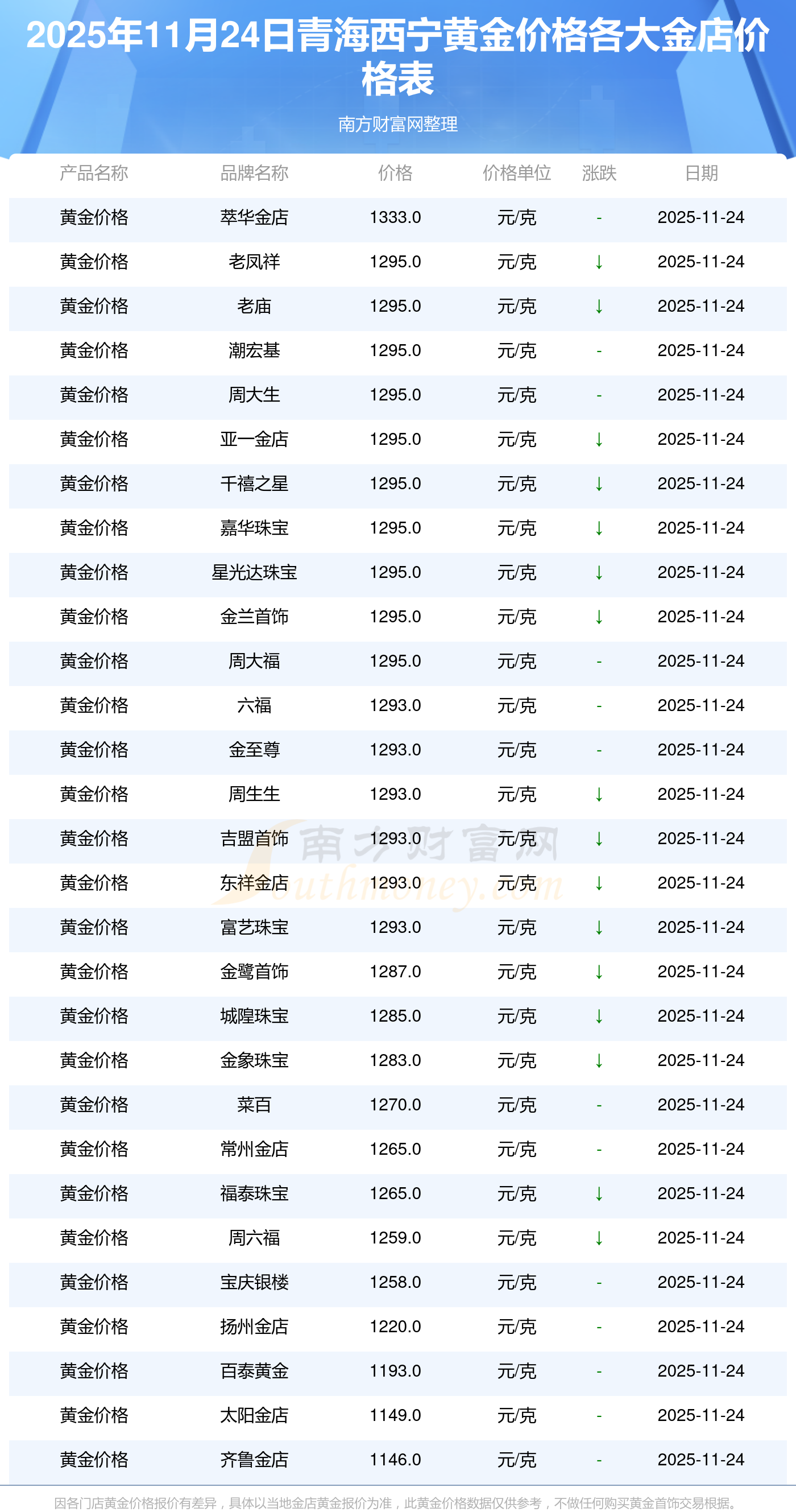 今天是2025年11月24日,青海西寧周大福、周大福、周大福、老鳳祥、老鳳祥、老鳳祥、周六福、周六福、周六福、周六福、六福等各大金店品牌黃金價(jià)格最新價(jià)格行情是這樣的:周大福17630.0、周大福40570.0、周大福1134.0元/克、老鳳祥1295.0元/克、老鳳祥600.0元/克、老鳳祥1295.0元/克、周六福1259.0元/克、周六福590.0元/克、周六福590.0元/克、周六福1154.0元/克、六福1293.0元/克。