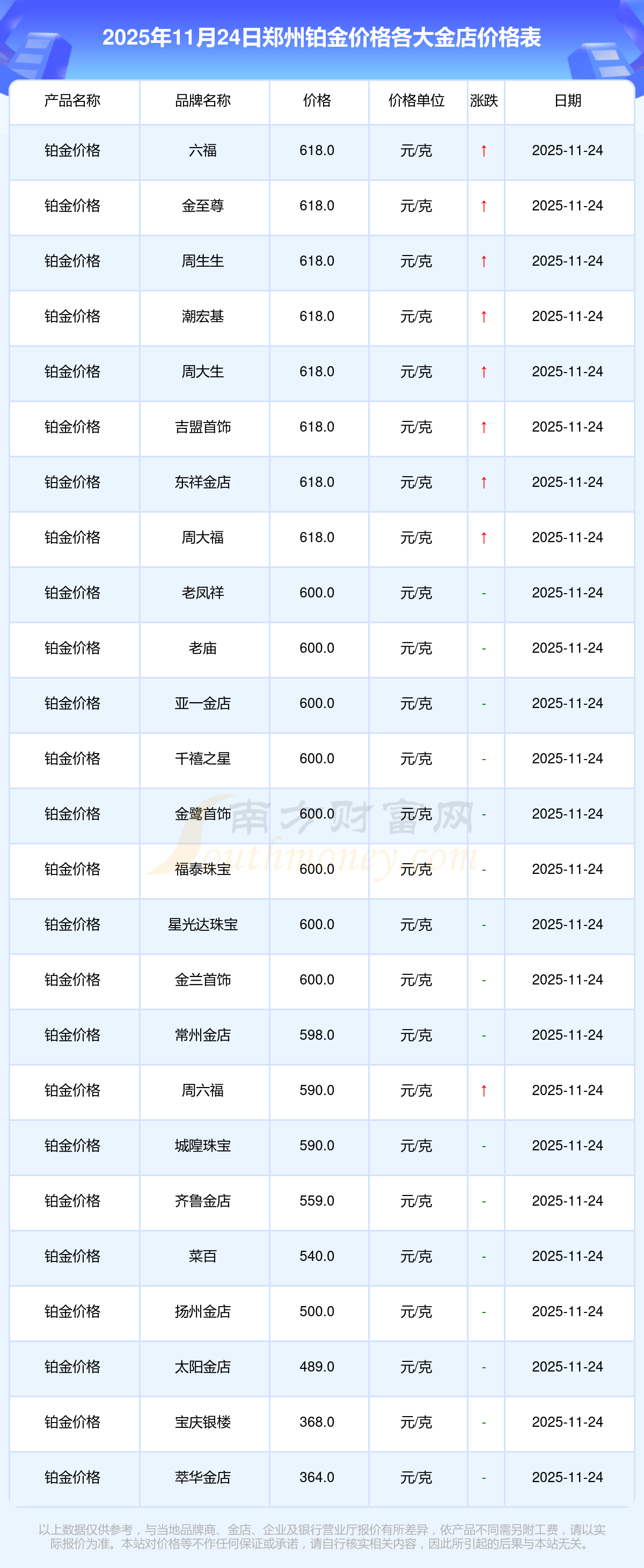 2025年11月24日鄭州各大金店鉑金價(jià)格最新價(jià)格:周大福17630.0,周大福40570.0,周大福1134.0元/克,老鳳祥1295.0元/克,老鳳祥600.0元/克,老鳳祥1295.0元/克,周六福1259.0元/克,周六福590.0元/克,周六福590.0元/克,周六福1154.0元/克,六福1293.0元/克。