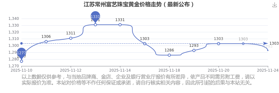 于 2025年11月24日,江蘇常州富藝珠寶黃金價格的克價為1293.0元/克。