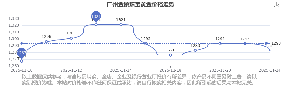 廣州金象珠寶在 2025年11月24日,黃金價(jià)格的售賣(mài)價(jià)格是 1283.0元/克。