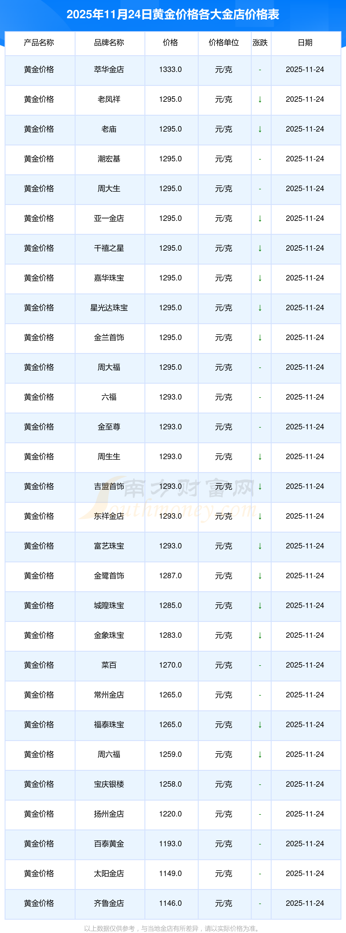 2025年11月24日各大金店黃金價格一克多少錢?各大金店黃金價格最新公布