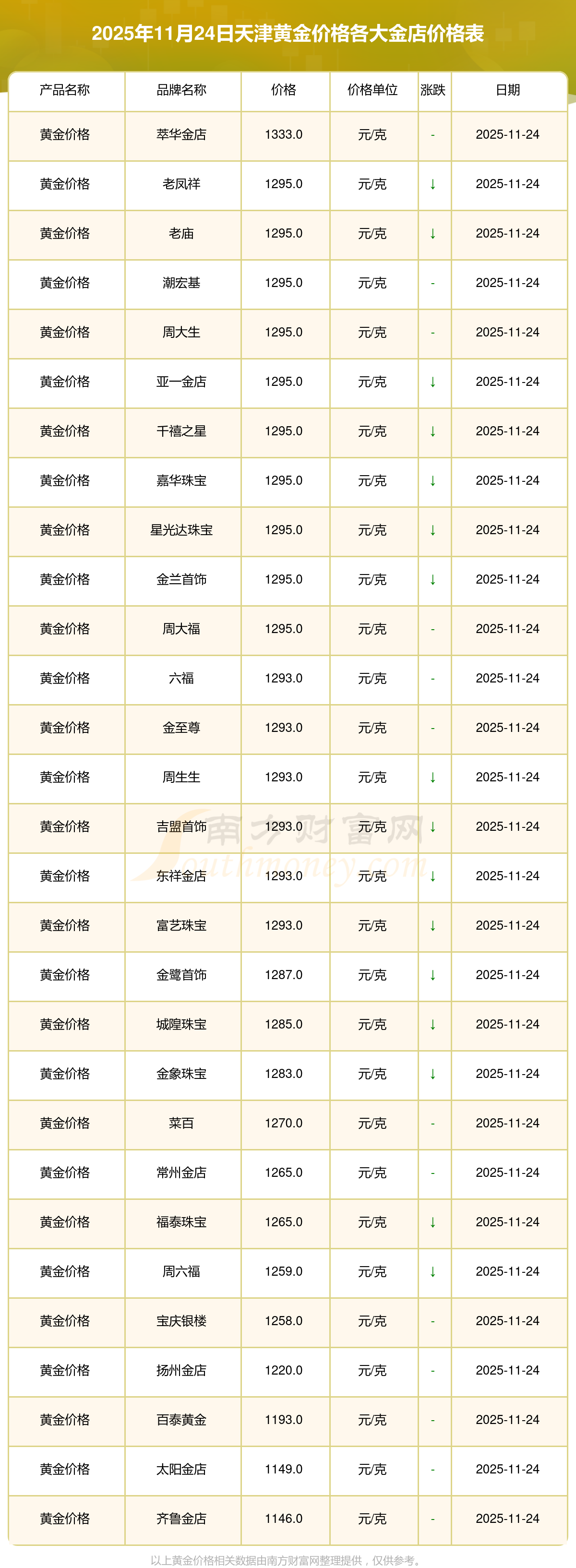 2025年11月24日天津各大金店黃金價(jià)格最新價(jià)格:周大福17630.0,周大福40570.0,周大福1134.0元/克,老鳳祥1295.0元/克,老鳳祥600.0元/克,老鳳祥1295.0元/克,周六福1259.0元/克,周六福590.0元/克,周六福590.0元/克,周六福1154.0元/克,六福1293.0元/克。