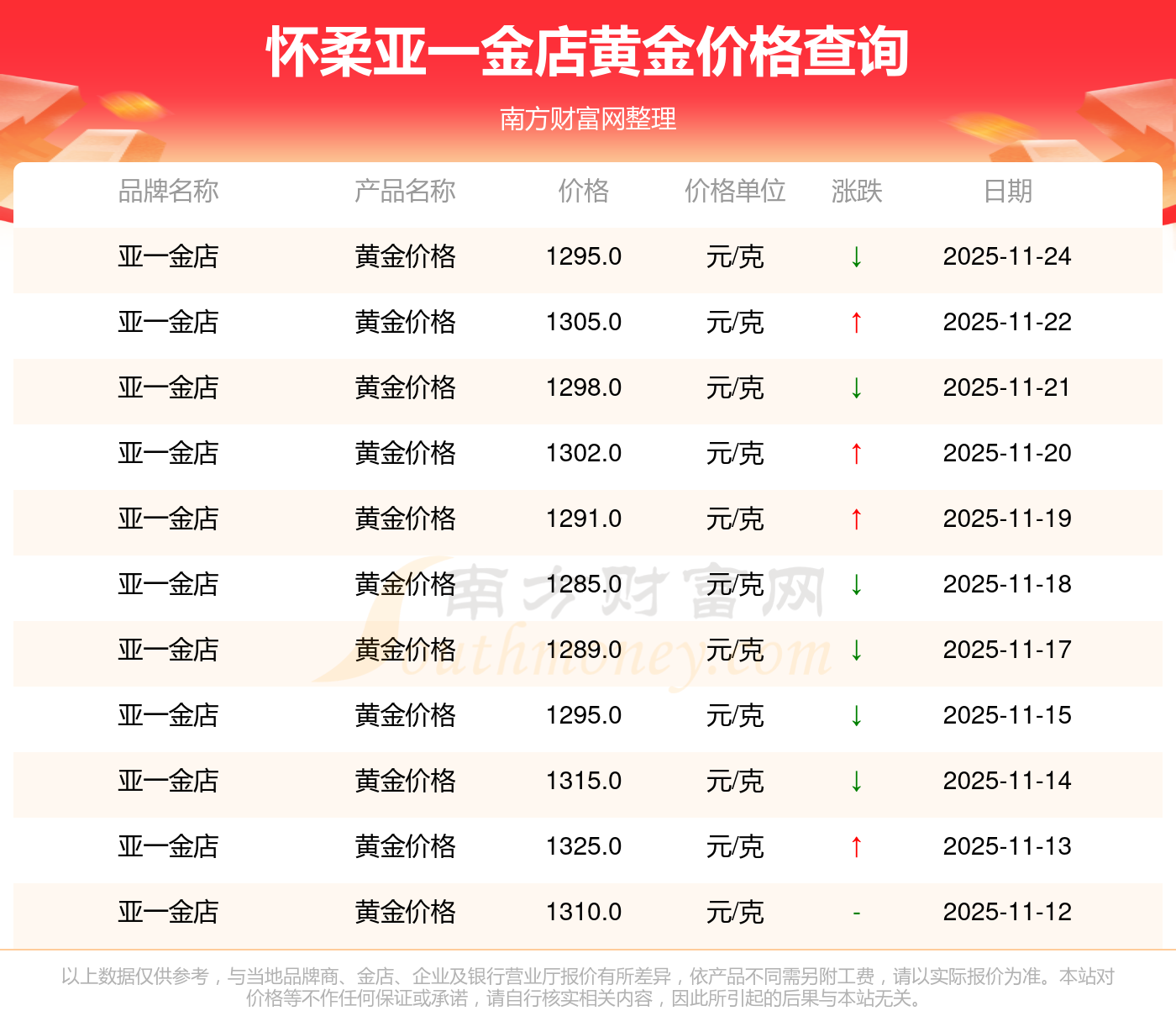 今日(2025年11月24日)??柔亞一金店黃金價格為1295.0元/克。