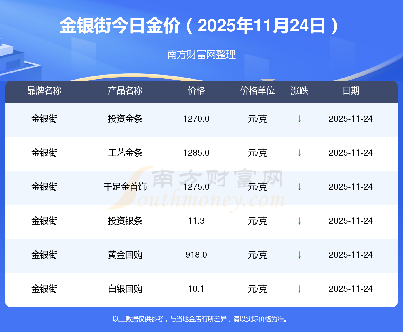 因各門(mén)店黃金價(jià)格報(bào)價(jià)有差異,具體以當(dāng)?shù)亟鸬挈S金報(bào)價(jià)為準(zhǔn),此黃金價(jià)格數(shù)據(jù)僅供參考,不做任何購(gòu)買(mǎi)黃金首飾交易根據(jù)。