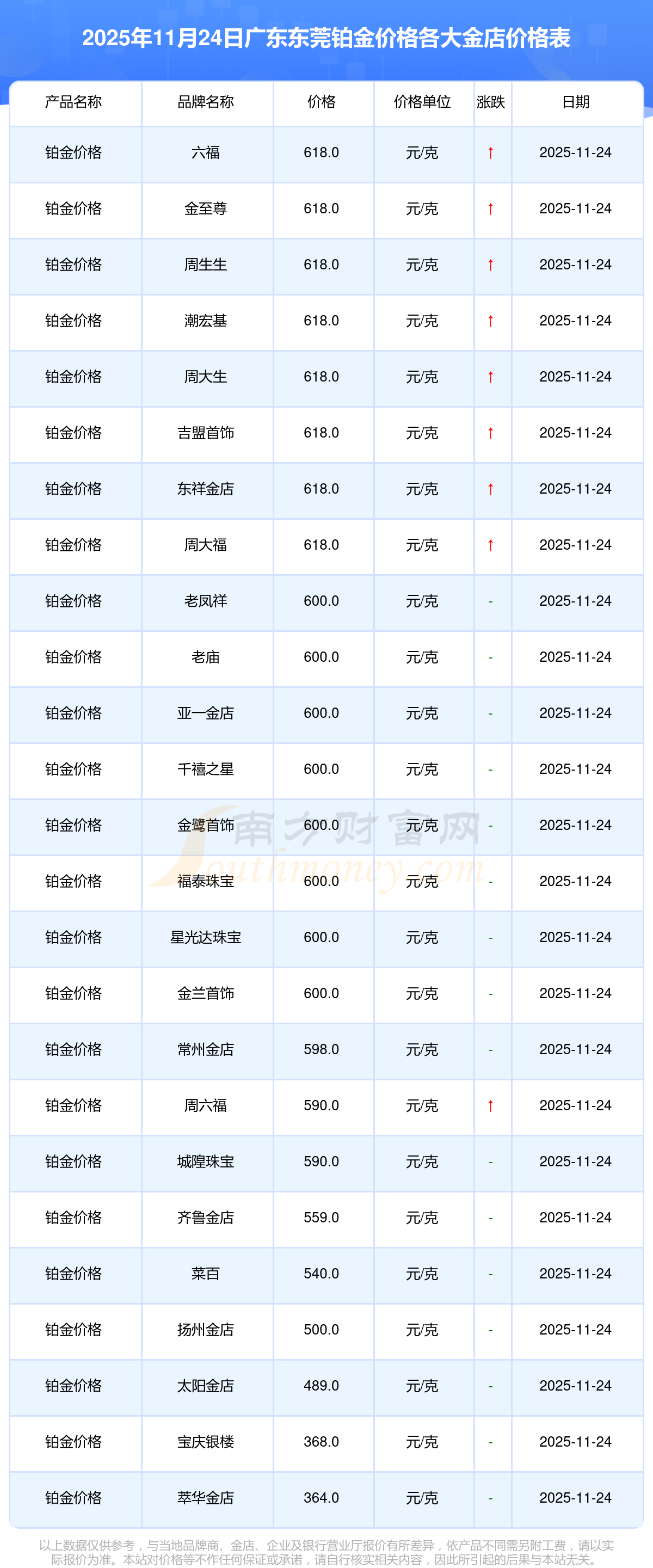 2025年11月24日,廣東東莞周大福、周大福、周大福、老鳳祥、老鳳祥、老鳳祥、周六福、周六福、周六福、周六福、六福等各大金店品牌鉑金價(jià)格今日價(jià)格如下:周大福17630.0、周大福40570.0、周大福1134.0元/克、老鳳祥1295.0元/克、老鳳祥600.0元/克、老鳳祥1295.0元/克、周六福1259.0元/克、周六福590.0元/克、周六福590.0元/克、周六福1154.0元/克、六福1293.0元/克。