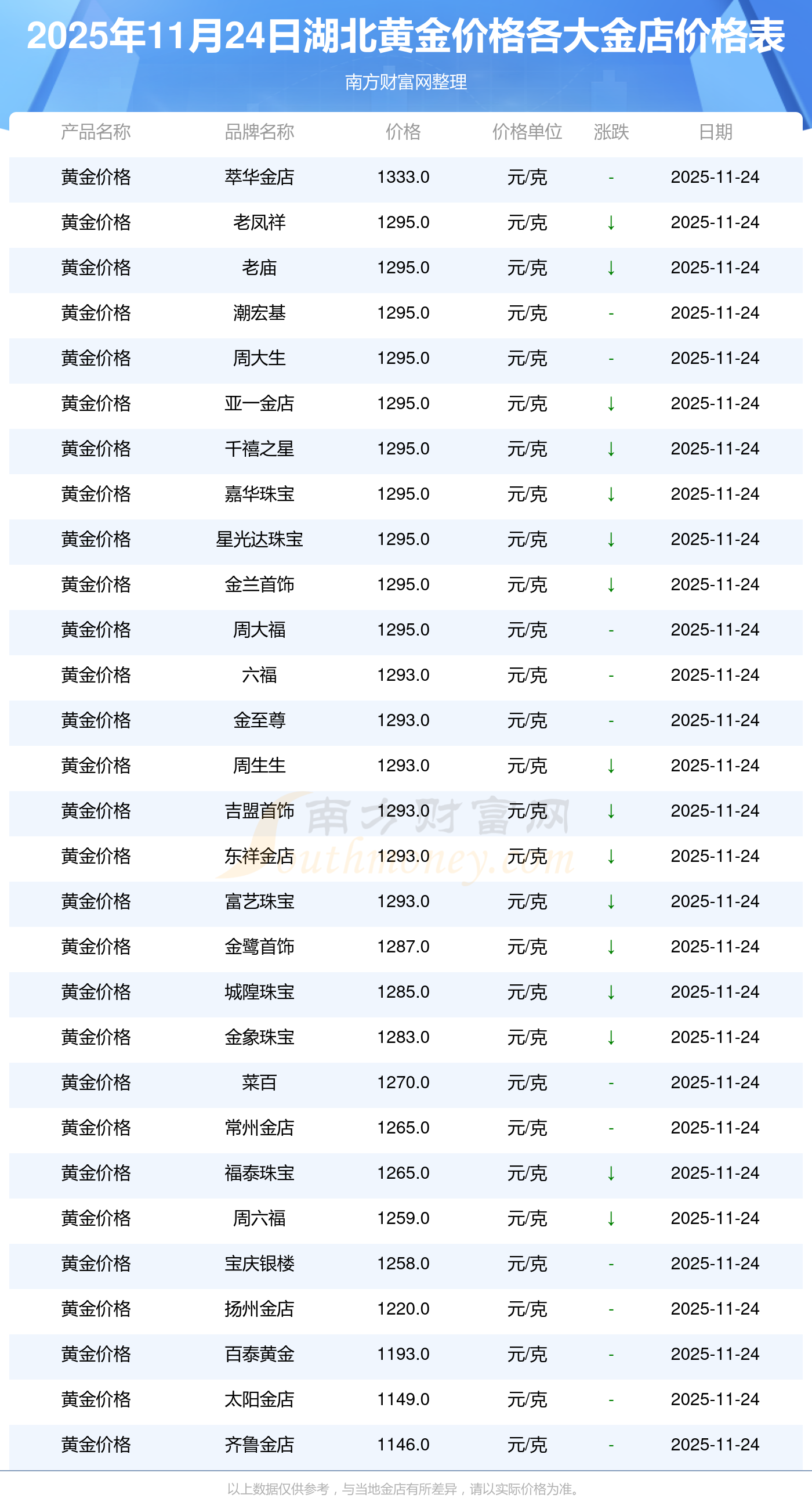 2025年11月24日湖北周大福、周大福、周大福、老鳳祥、老鳳祥、老鳳祥、周六福、周六福、周六福、周六福、六福等各大金店品牌黃金價(jià)格最新價(jià)格如下:周大福鉑金價(jià)格(香港)17630.0,周大福金條價(jià)格(香港)40570.0,周大福金條金價(jià)(內(nèi)地)1134.0元/克,老鳳祥黃金價(jià)格1295.0元/克,老鳳祥鉑金價(jià)格600.0元/克,老鳳祥足金價(jià)格1295.0元/克,周六福黃金價(jià)格1259.0元/克,周六福鉑金價(jià)格590.0元/克,周六福PT999鉑金價(jià)格590.0元/克,周六福金條價(jià)格1154.0元/克,六福黃金價(jià)格1293.0元/克。