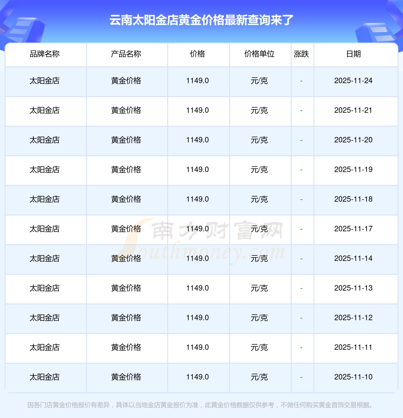云南太陽金店黃金價格現(xiàn)在每克多少錢,今日黃金一克的標價是多少?今日云南太陽金店黃金價格查詢,今日云南太陽金店黃金價格:1149.0元/克。