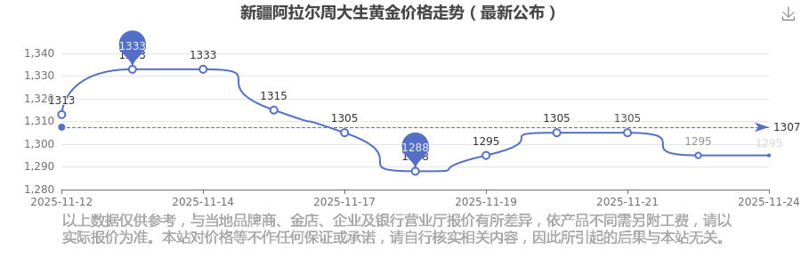 今日(2025年11月24日),新疆阿拉爾周大生黃金價(jià)格每克的價(jià)值為1295.0元/克。