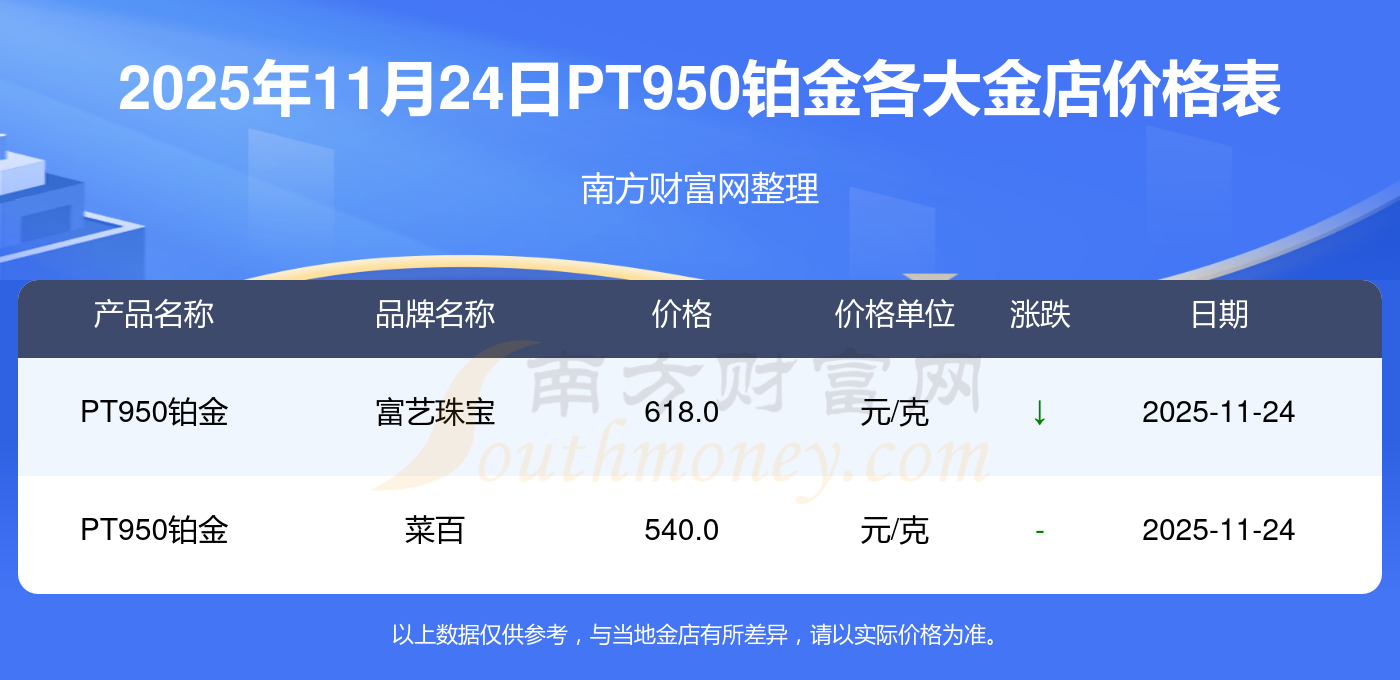 2025年11月24日周大福、周大福、周大福、老鳳祥、老鳳祥、老鳳祥、周六福、周六福、周六福、周六福、六福等各大金店品牌PT950鉑金最新價(jià)格如下:周大福鉑金價(jià)格(香港)17630.0,周大福金條價(jià)格(香港)40570.0,周大福金條金價(jià)(內(nèi)地)1134.0元/克,老鳳祥黃金價(jià)格1295.0元/克,老鳳祥鉑金價(jià)格600.0元/克,老鳳祥足金價(jià)格1295.0元/克,周六福黃金價(jià)格1259.0元/克,周六福鉑金價(jià)格590.0元/克,周六福PT999鉑金價(jià)格590.0元/克,周六福金條價(jià)格1154.0元/克,六福黃金價(jià)格1293.0元/克。
