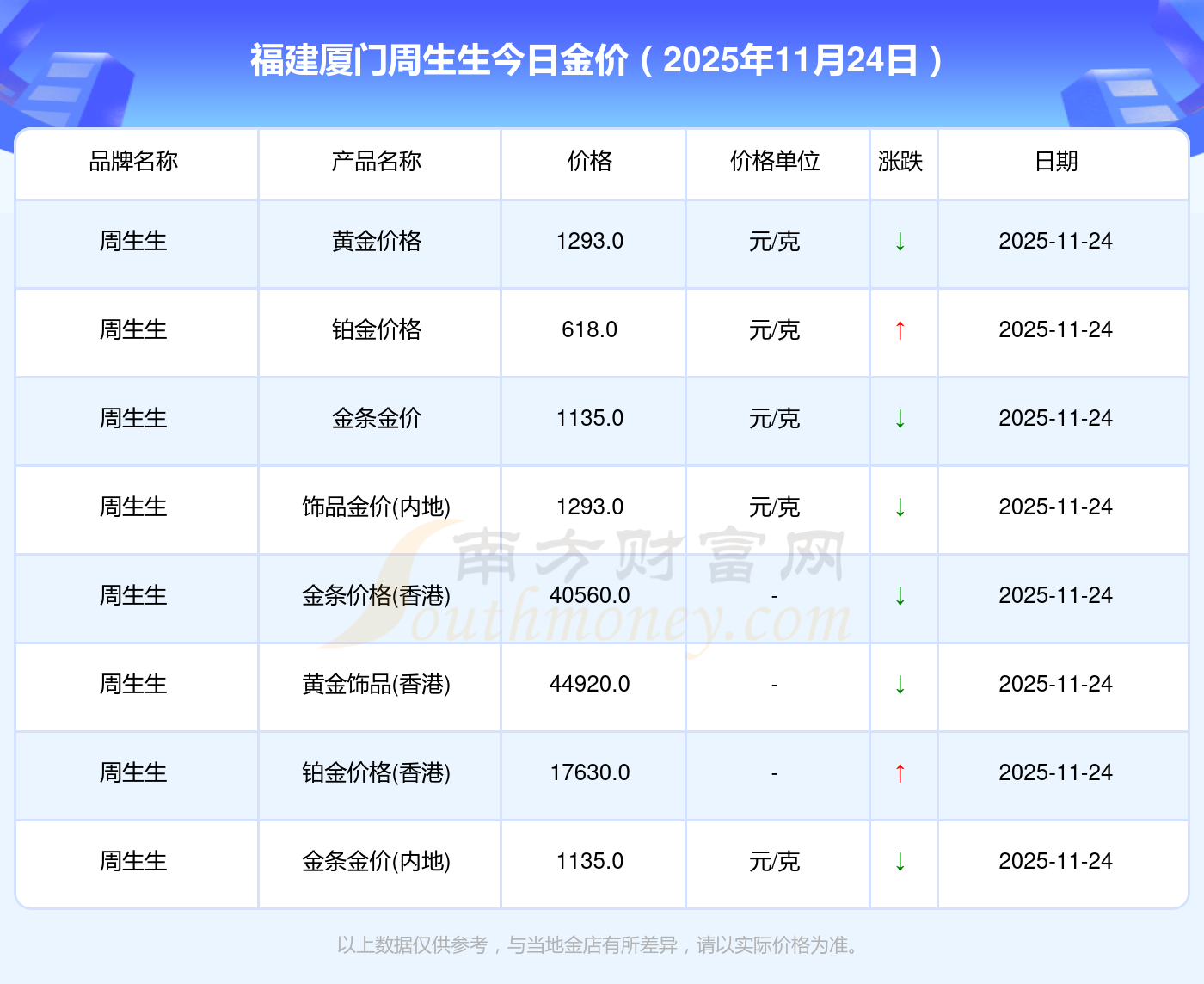 2025年11月24日福建廈門周生生一克黃金對應(yīng)的價格是多少?鉑金價格(香港)17630.0,金條價格(香港)40570.0,金條金價(內(nèi)地)1134.0元/克,黃金價格1295.0元/克,鉑金價格600.0元/克,足金價格1295.0元/克,黃金價格1259.0元/克,鉑金價格590.0元/克,PT999鉑金價格590.0元/克,金條價格1154.0元/克,黃金價格1293.0元/克。