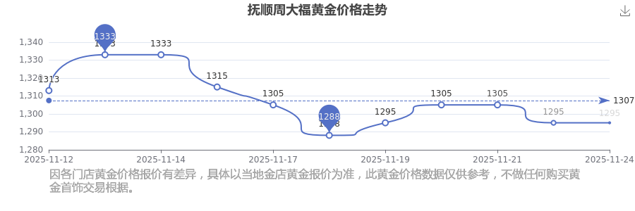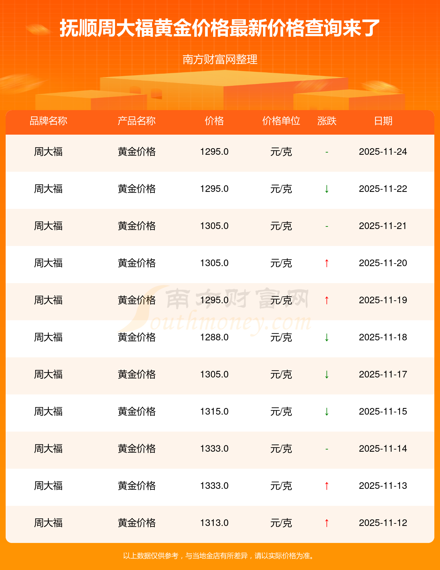 2025年11月24日,撫順周大福黃金價格每克的價值量定格在1295.0元/克。