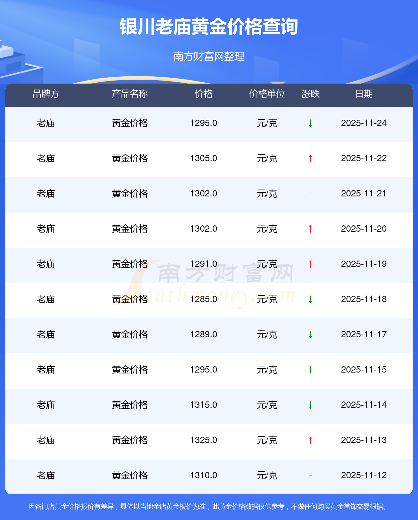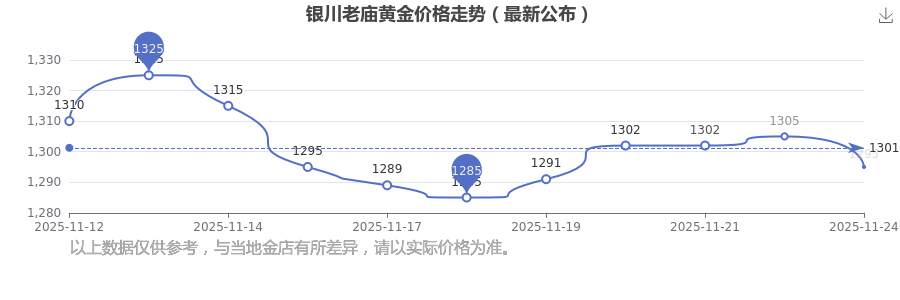 于 2025年11月24日,銀川老廟黃金價(jià)格的克價(jià)為1295.0元/克。