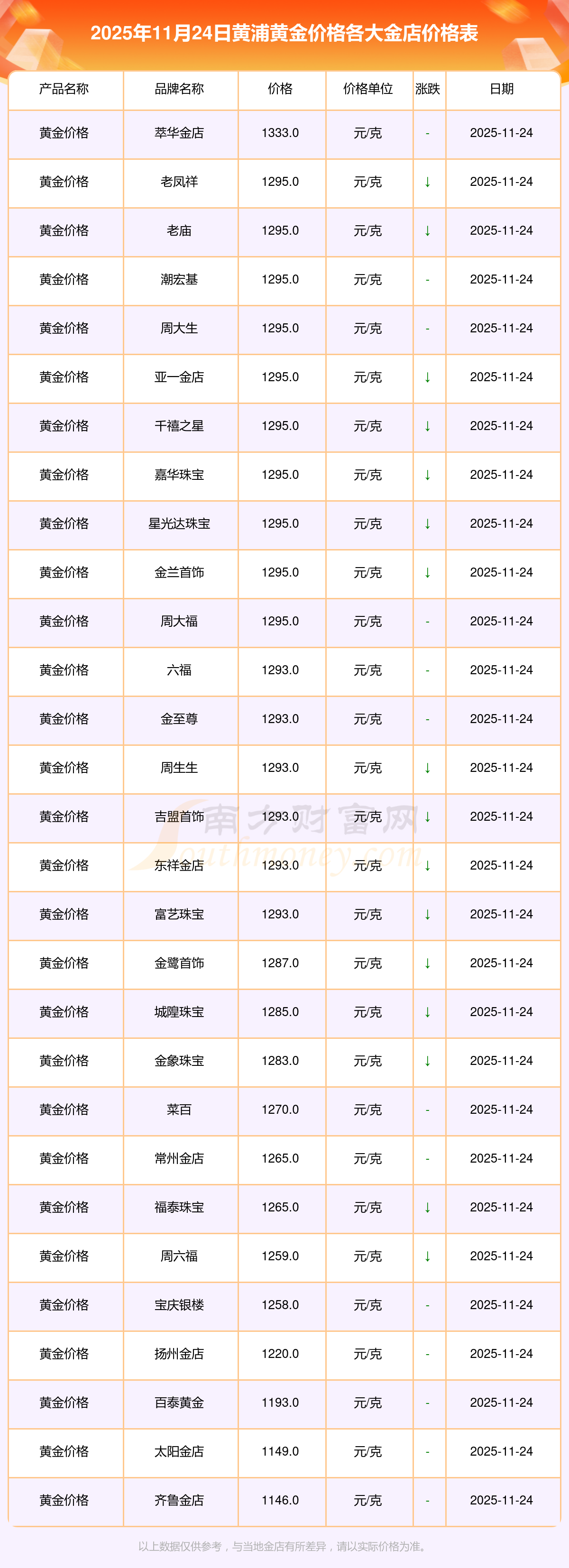 今天是2025年11月24日,黃浦周大福、周大福、周大福、老鳳祥、老鳳祥、老鳳祥、周六福、周六福、周六福、周六福、六福等各大金店品牌黃金價(jià)格最新價(jià)格行情是這樣的:周大福17630.0、周大福40570.0、周大福1134.0元/克、老鳳祥1295.0元/克、老鳳祥600.0元/克、老鳳祥1295.0元/克、周六福1259.0元/克、周六福590.0元/克、周六福590.0元/克、周六福1154.0元/克、六福1293.0元/克。