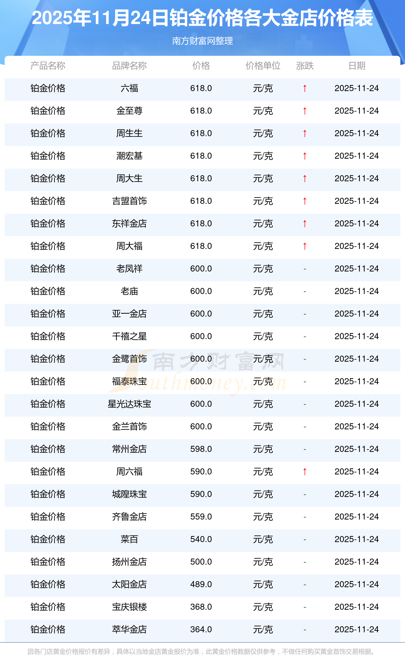 2025年11月24日各大金店鉑金價格最新價格:周大福17630.0,周大福40570.0,周大福1134.0元/克,老鳳祥1295.0元/克,老鳳祥600.0元/克,老鳳祥1295.0元/克,周六福1259.0元/克,周六福590.0元/克,周六福590.0元/克,周六福1154.0元/克,六福1293.0元/克。