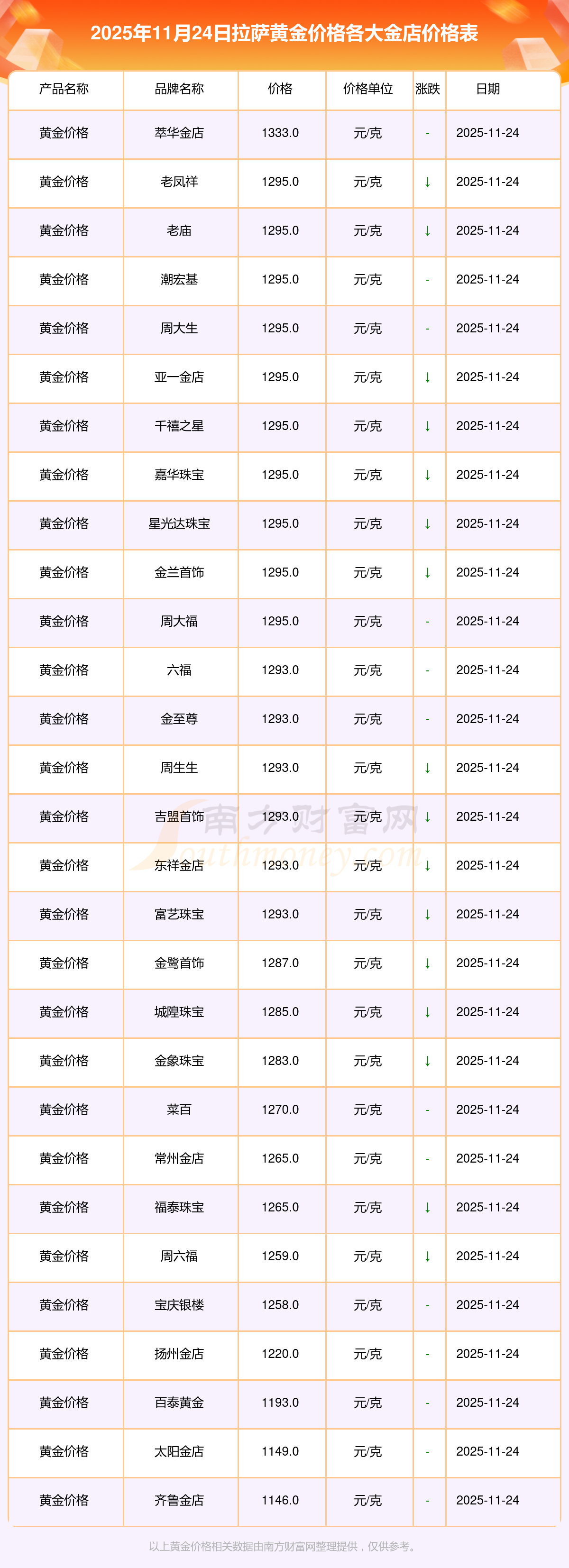 今天是2025年11月24日,拉薩周大福、周大福、周大福、老鳳祥、老鳳祥、老鳳祥、周六福、周六福、周六福、周六福、六福等各大金店品牌黃金價(jià)格最新價(jià)格如下:周大福17630.0、周大福40570.0、周大福1134.0元/克、老鳳祥1295.0元/克、老鳳祥600.0元/克、老鳳祥1295.0元/克、周六福1259.0元/克、周六福590.0元/克、周六福590.0元/克、周六福1154.0元/克、六福1293.0元/克。