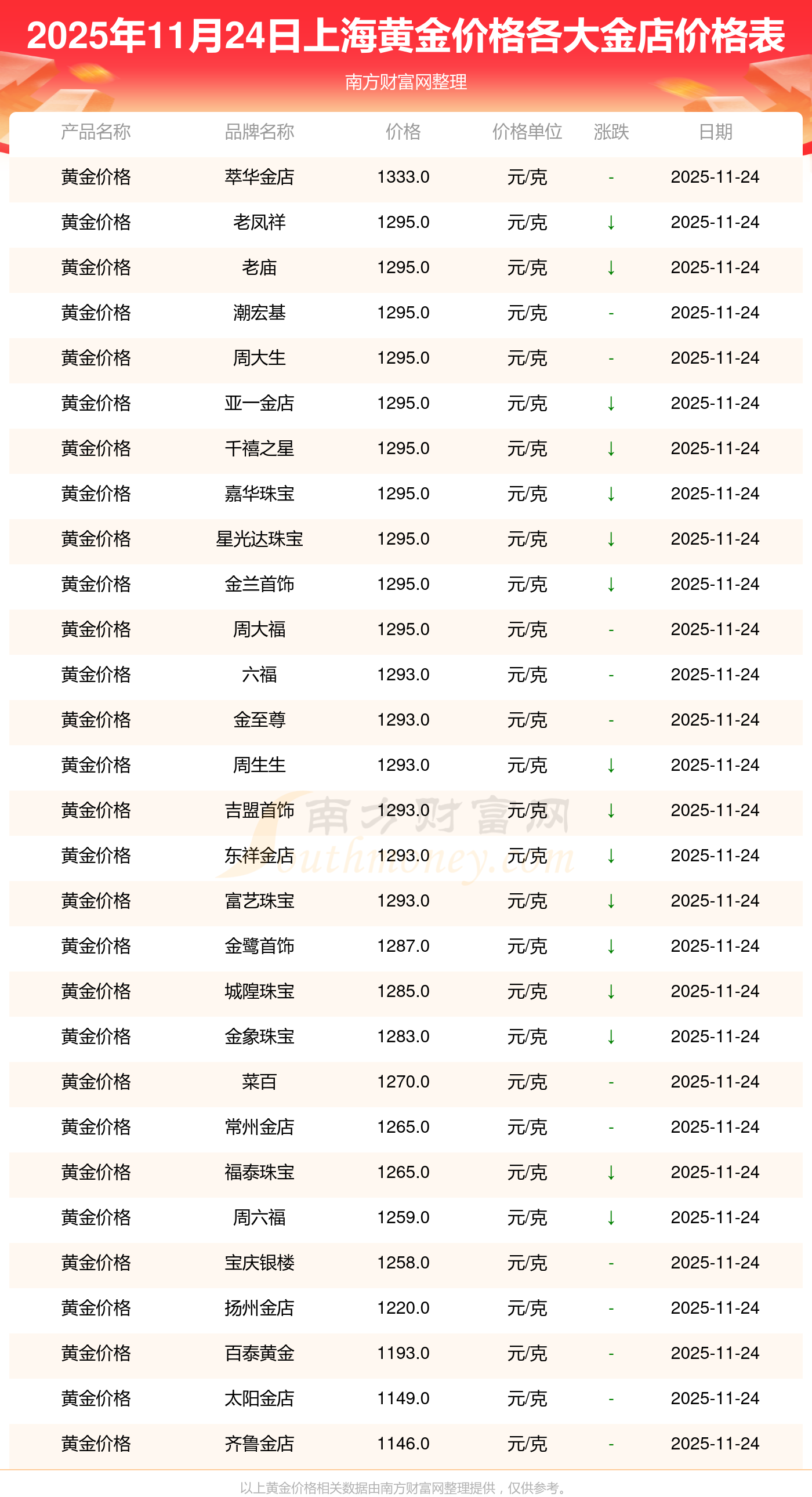 二、2025年11月24日今日上海各金店黃金價格實時行情匯總