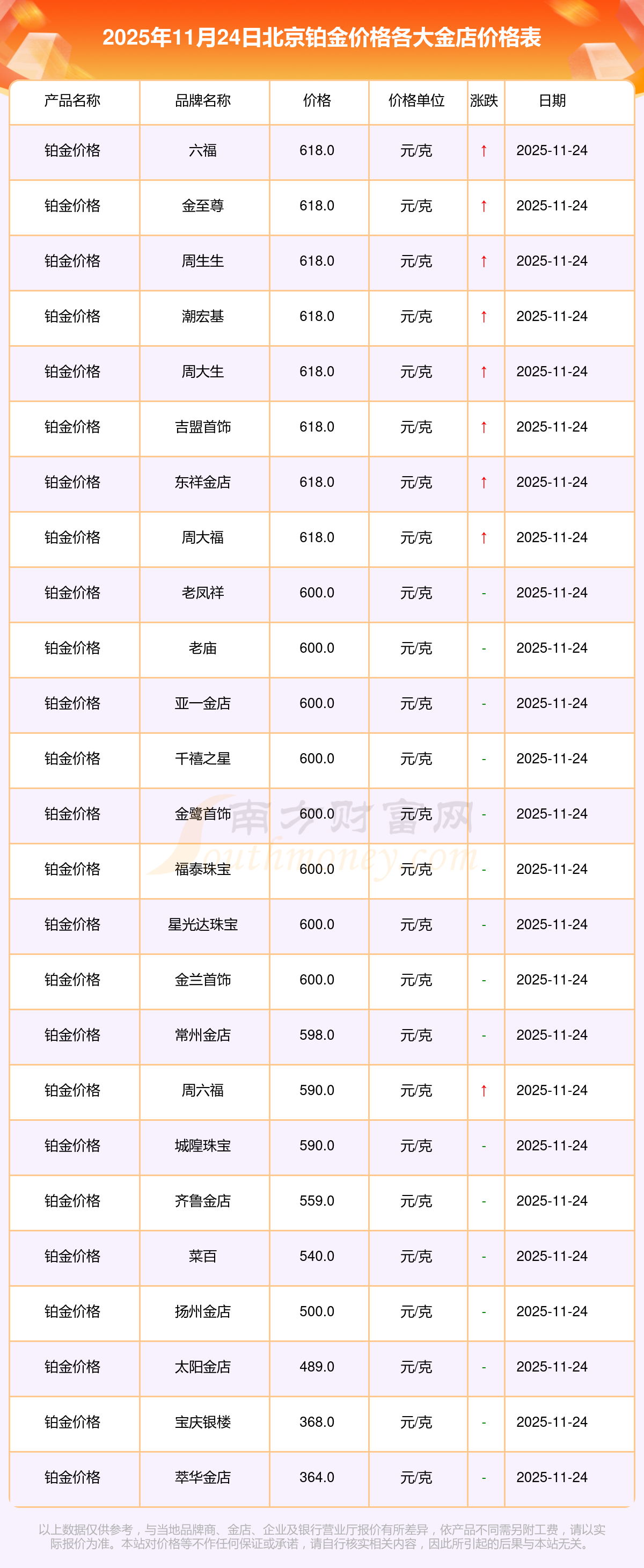 今天是2025年11月24日,北京周大福、周大福、周大福、老鳳祥、老鳳祥、老鳳祥、周六福、周六福、周六福、周六福、六福等各大金店品牌鉑金價格最新價格如下:周大福17630.0、周大福40570.0、周大福1134.0元/克、老鳳祥1295.0元/克、老鳳祥600.0元/克、老鳳祥1295.0元/克、周六福1259.0元/克、周六福590.0元/克、周六福590.0元/克、周六福1154.0元/克、六福1293.0元/克。
