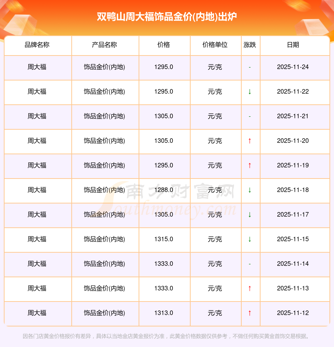 2025年11月24日,周大福、周大福、周大福、老鳳祥、老鳳祥、老鳳祥、周六福、周六福、周六福、周六福、六福等各大金店品牌飾品金價(jià)(內(nèi)地)今日價(jià)格如下:周大福17630.0、周大福40570.0、周大福1134.0元/克、老鳳祥1295.0元/克、老鳳祥600.0元/克、老鳳祥1295.0元/克、周六福1259.0元/克、周六福590.0元/克、周六福590.0元/克、周六福1154.0元/克、六福1293.0元/克。