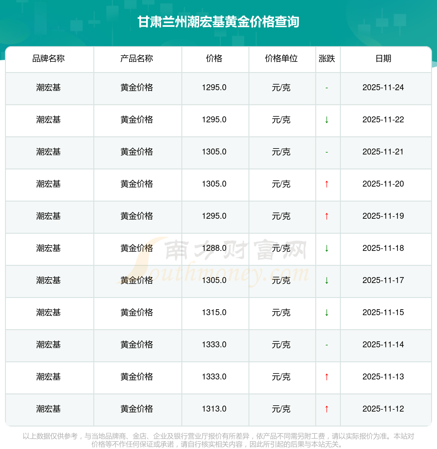 2025年11月24日,今日甘肅蘭州潮宏基黃金價格:1295.0元/克。