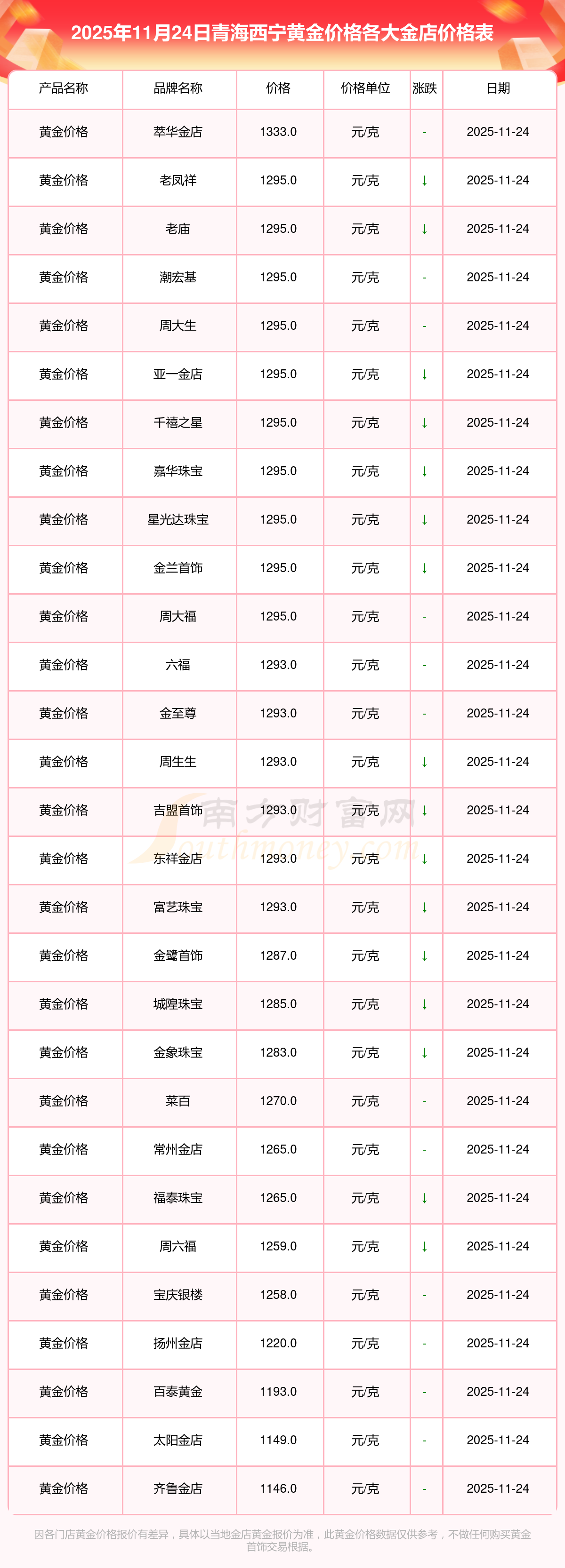 2025年11月24日青海西寧周大福、周大福、周大福、老鳳祥、老鳳祥、老鳳祥、周六福、周六福、周六福、周六福、六福等各大金店品牌黃金價格最新價格行情來了,如下:周大福鉑金價格(香港)17630.0,周大福金條價格(香港)40570.0,周大福金條金價(內(nèi)地)1134.0元/克,老鳳祥黃金價格1295.0元/克,老鳳祥鉑金價格600.0元/克,老鳳祥足金價格1295.0元/克,周六福黃金價格1259.0元/克,周六福鉑金價格590.0元/克,周六福PT999鉑金價格590.0元/克,周六福金條價格1154.0元/克,六福黃金價格1293.0元/克。