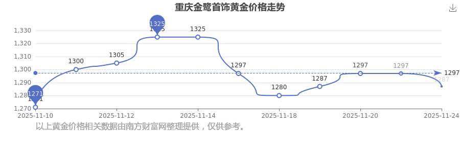 今日(2025年11月24日),重慶金鷺首飾黃金價(jià)格每克的價(jià)值為1287.0元/克。