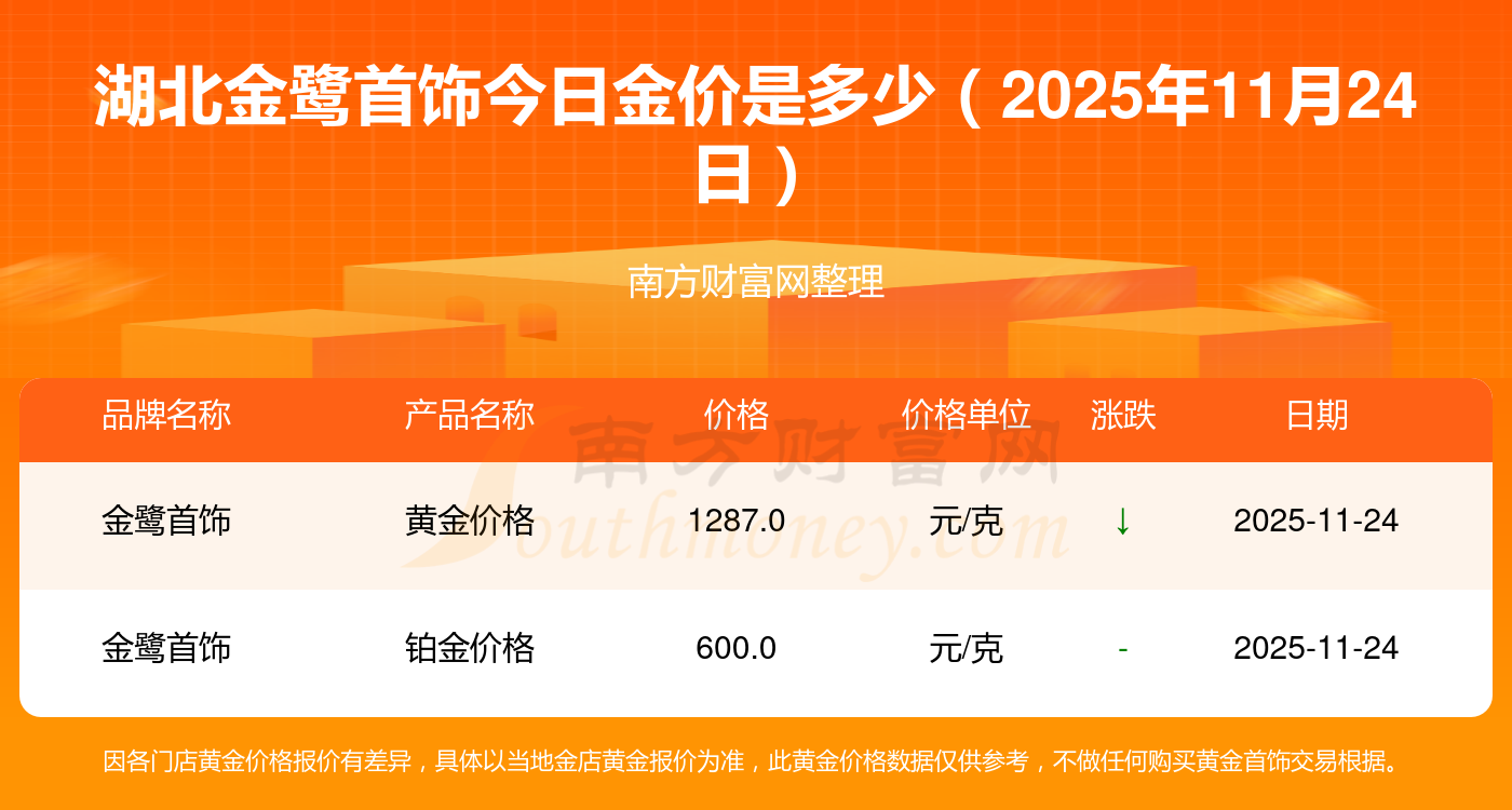 今日黃金價(jià)格具體是多少?現(xiàn)在一克黃金賣多少錢?2025年11月24日湖北金鷺首飾一克黃金對(duì)應(yīng)的價(jià)格是多少?鉑金價(jià)格(香港)17630.0,金條價(jià)格(香港)40570.0,金條金價(jià)(內(nèi)地)1134.0元/克,黃金價(jià)格1295.0元/克,鉑金價(jià)格600.0元/克,足金價(jià)格1295.0元/克,黃金價(jià)格1259.0元/克,鉑金價(jià)格590.0元/克,PT999鉑金價(jià)格590.0元/克,金條價(jià)格1154.0元/克,黃金價(jià)格1293.0元/克。